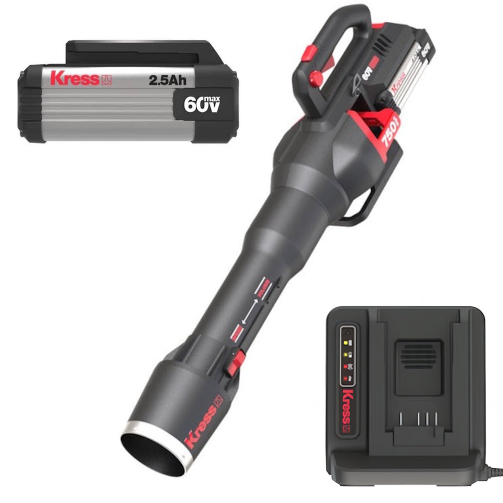 Complete Kit Included: Comes with the Kress KG560 60V blower, KA3712 3 A charger, variable nozzle, and KA3001 2.5 Ah lithium-ion battery.