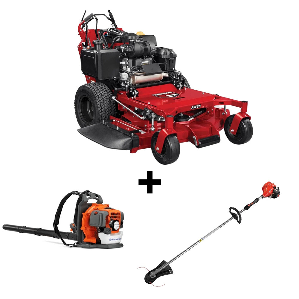 This package deal includes a 52 inch Ferris FW45 (5901892) with a 28 horsepower Vanguard EFI engine, one Husqvarna 130BT backpack blower, and one Husqvarna 128LD straight-shaft string trimmer.