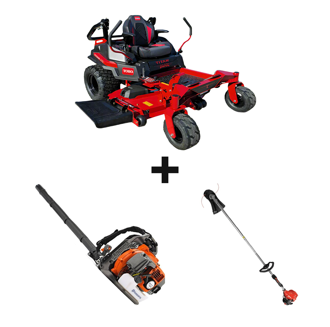 This package deal includes a Toro 76606 60-inch Titan MAX zero-turn mower with a 26HP Kohler engine, one Husqvarna 150BT backpack blower, and one Echo SRM-225 - 59" Straight Shaft Grass String Trimmer.