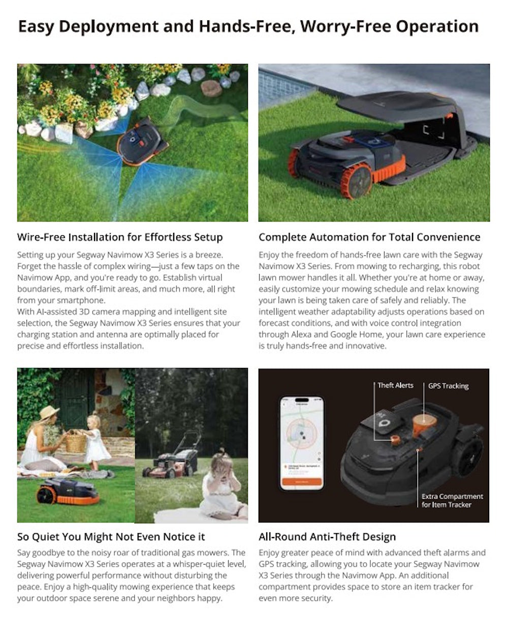 • Effortless Wire-Free Setup: Set up in three easy steps with AI-assisted mapping. Use the app to define boundaries, set safe zones, and customize mowing zones without perimeter wires.