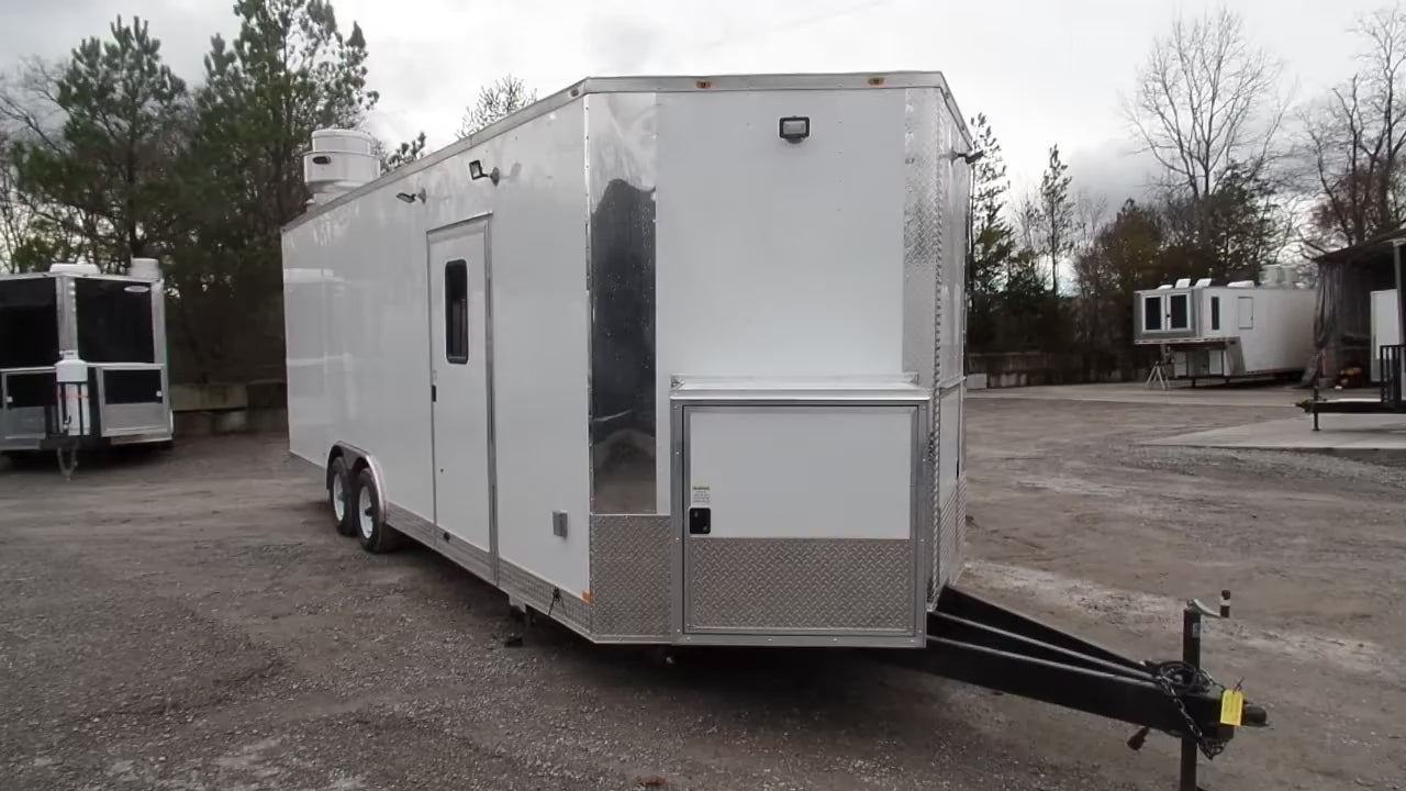 This 8.5 ft x 24 ft white concession trailer offers a 6 ft x 4 ft concession window with glass, screens and a flip out counter outside, 9 foot commercial grease hood, sink package, and more. The sink package includes a hand sink, 3 compartment sink, 30 gallons fresh, 50 gallons waste and a 2.5 gallon water heater.