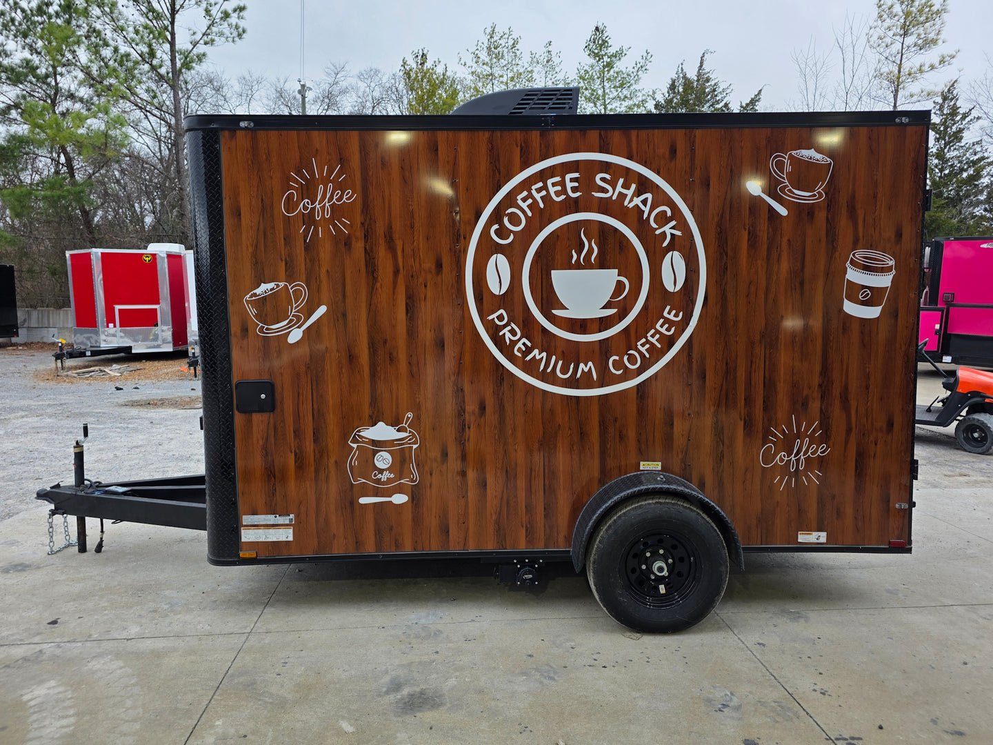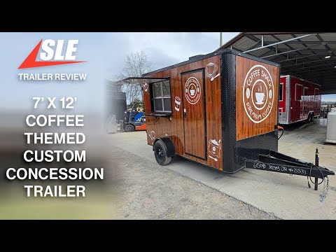 This 7' x 12' coffee-themed custom concession trailer features a spacious 7' interior height, providing ample room for efficient service and equipment setup. Its wood-skinned polycore exterior delivers a durable, eye-catching rustic look, while a 5,200 lb braked axle, 50-amp electric package, and steel wheels with radial tires ensure dependable towing and power. Designed for year-round events, it includes A/C and heat plus a 4-foot concession window with flip-up counter for smooth customer service operations.
