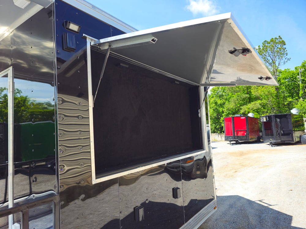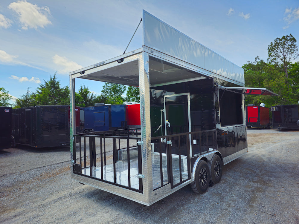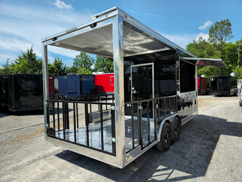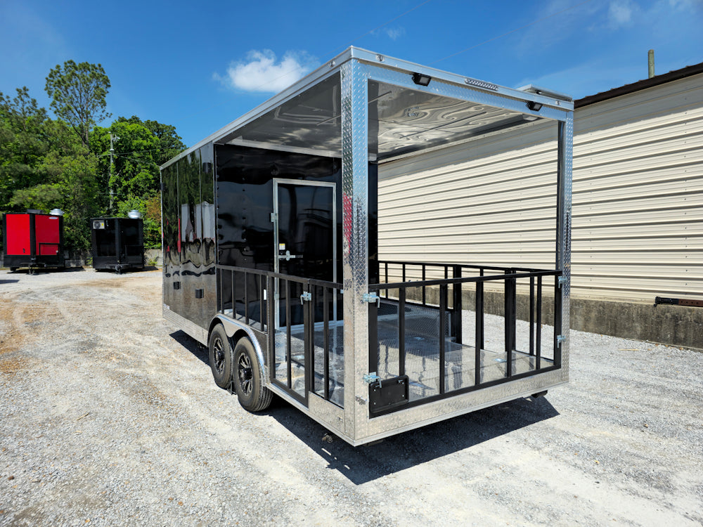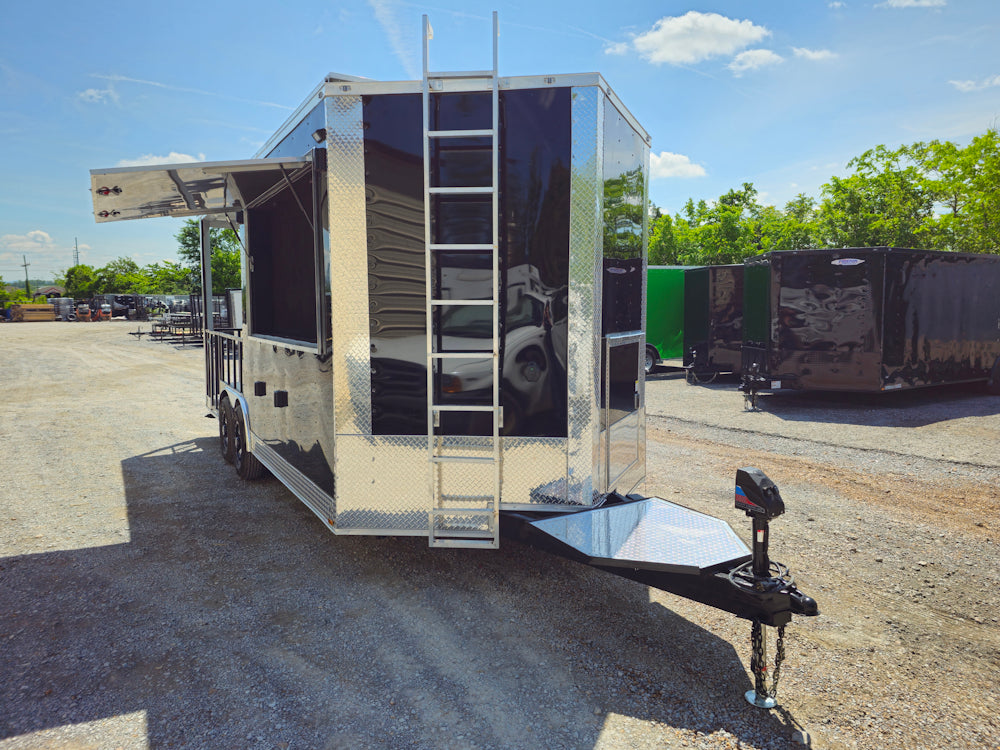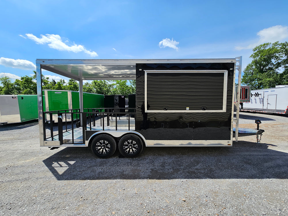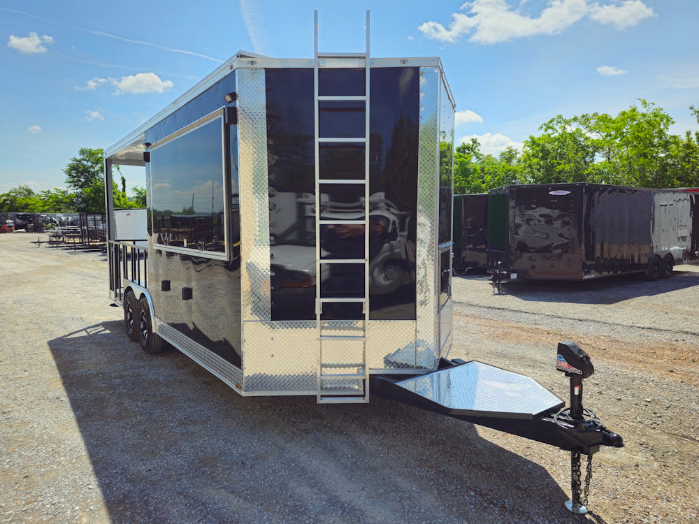This 8.5' x 20' black concession trailer, with a 10' railed rear porch, is perfect for BBQ, food service, and event catering. It features a spacious 8' interior height, robust 100-amp electrical system, A/C and heat, insulated walls, and a commercial-grade sink setup. With premium touches like a rooftop marquee, LED lighting, and sleek aluminum finishes, it’s built for performance and professional presentation.