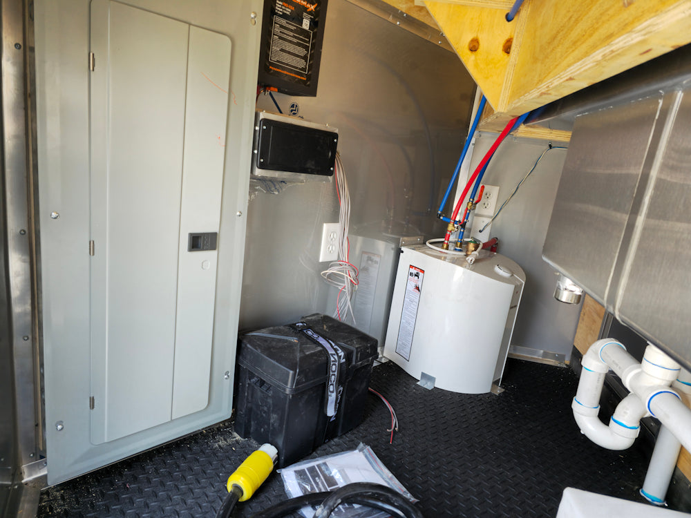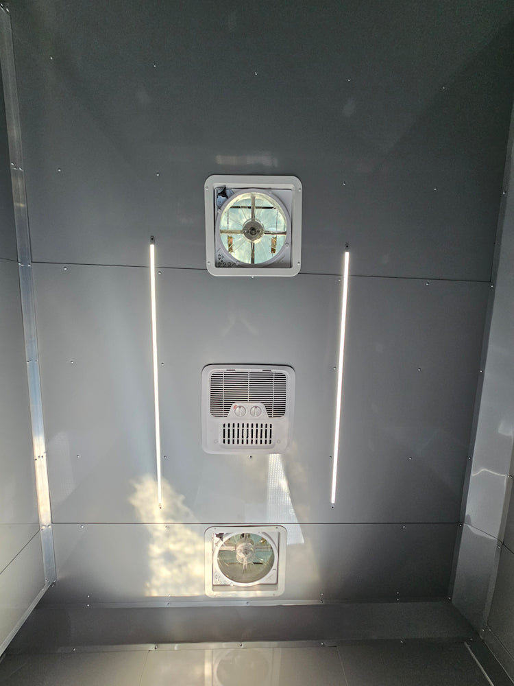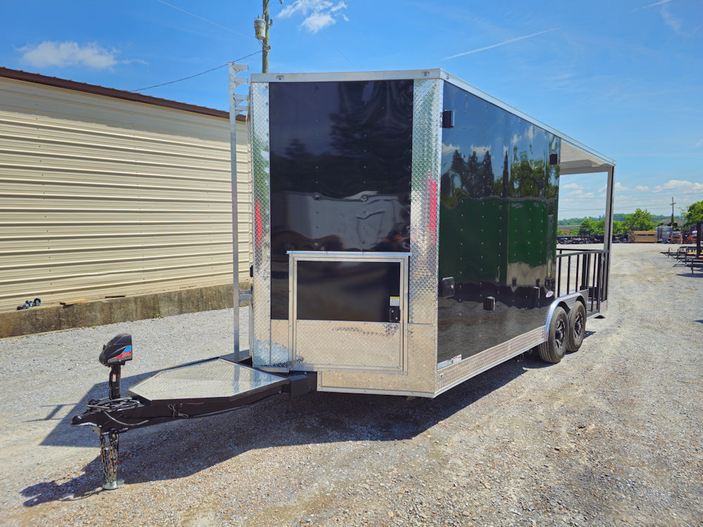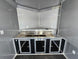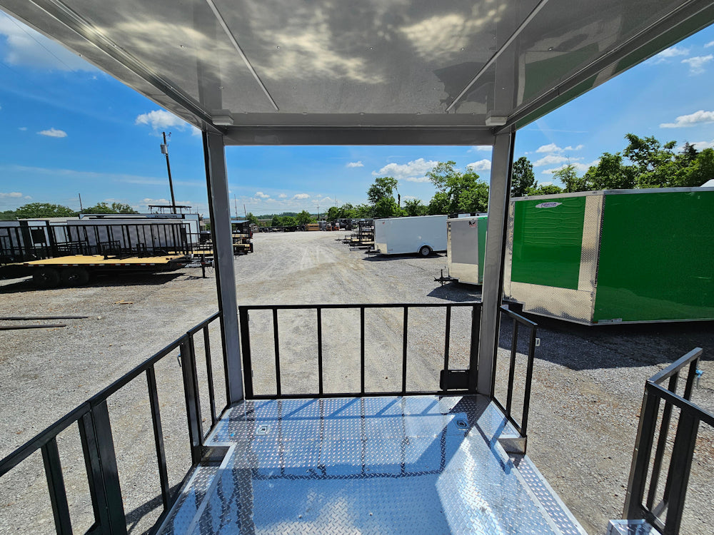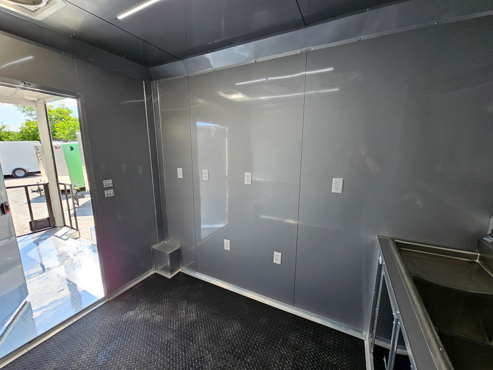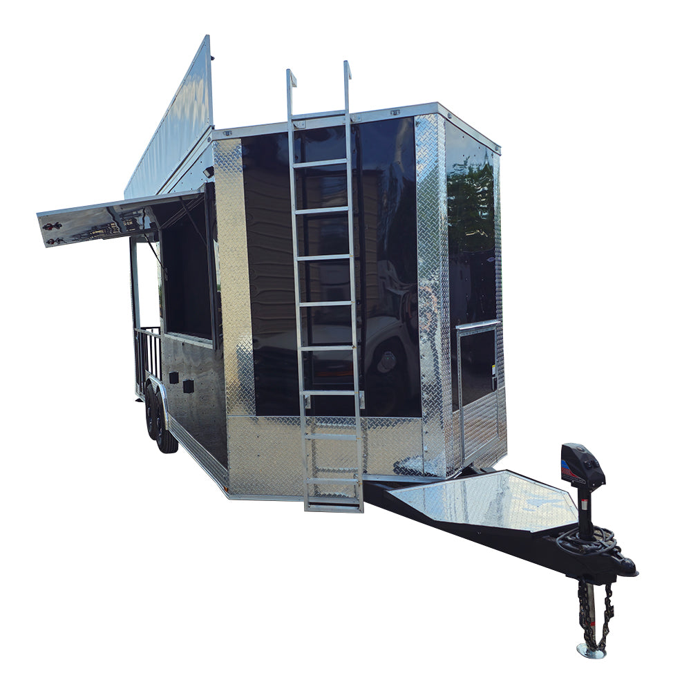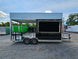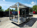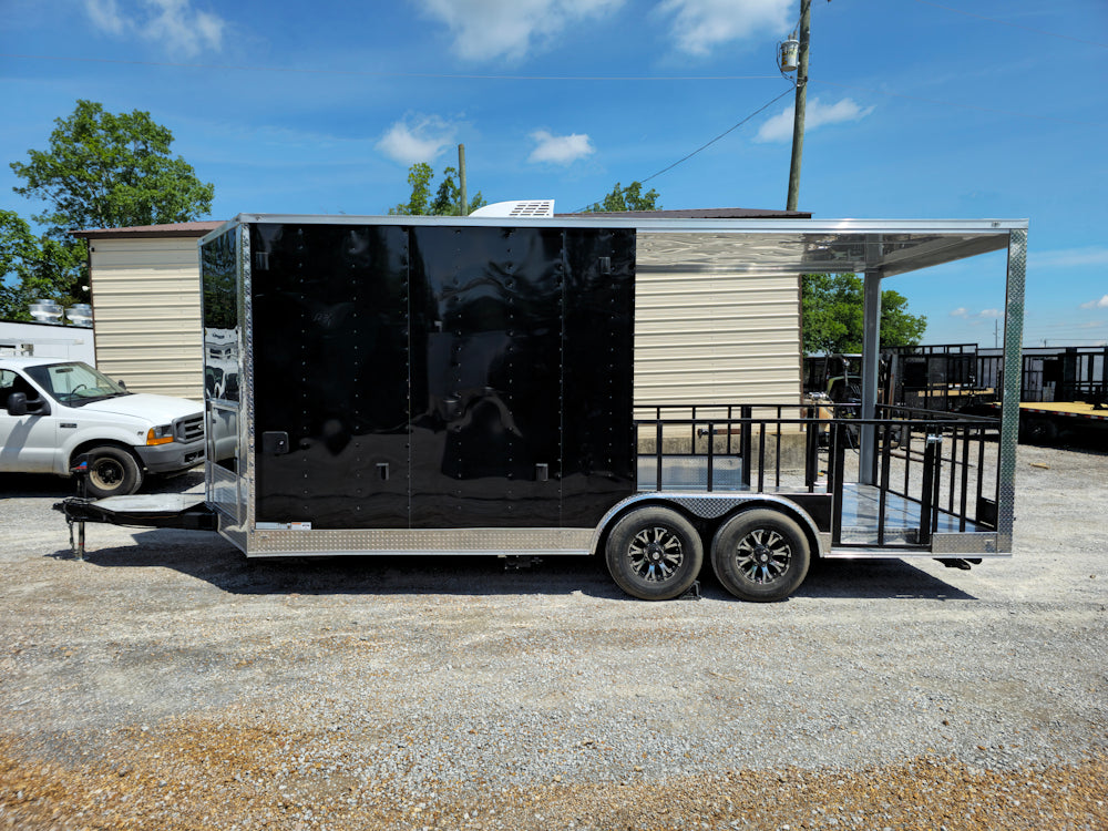 This 8.5' x 20' black concession trailer, with a 10' railed rear porch, is perfect for BBQ, food service, and event catering. It features a spacious 8' interior height, robust 100-amp electrical system, A/C and heat, insulated walls, and a commercial-grade sink setup. With premium touches like a rooftop marquee, LED lighting, and sleek aluminum finishes, it’s built for performance and professional presentation.