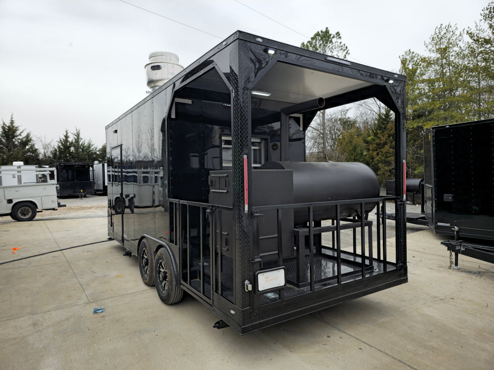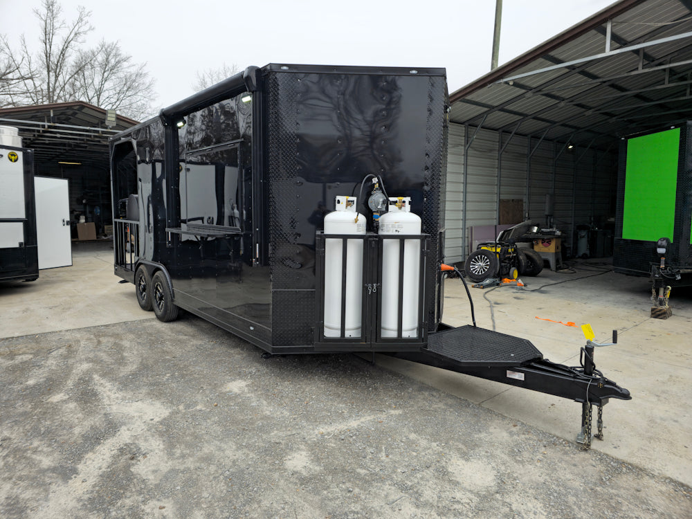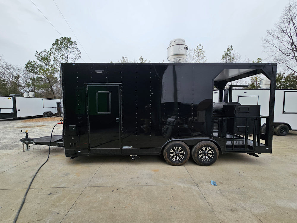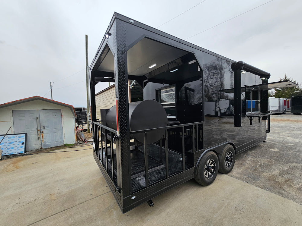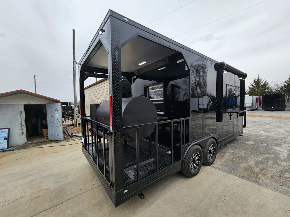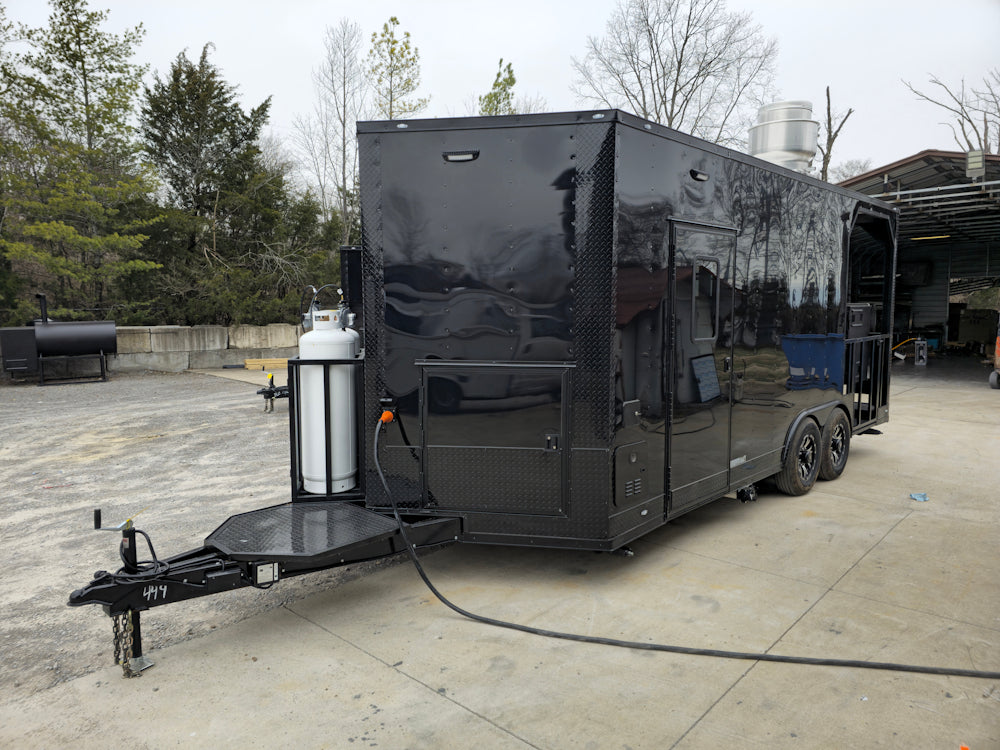 Designed for versatility and performance, this 8.5' x 20' enclosed trailer features a spacious 6' railed porch, premium black exterior, and an 8' interior height for maximum functionality. Equipped with (2) 7,000 lb axles, a 100 Amp electrical system, and a climate-controlled interior, it ensures smooth towing, ample power, and all-weather comfort. Fully loaded with stainless steel countertops, high-end appliances, a 250-gallon smoker, and fire suppression and propane packages, this trailer is the ultimate mobile kitchen or workstation for any professional operation.