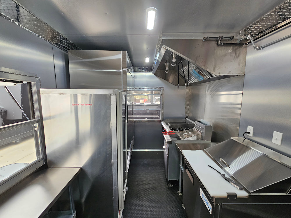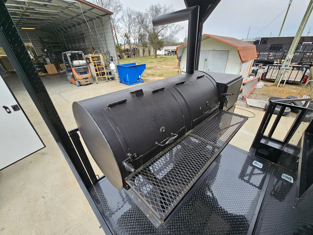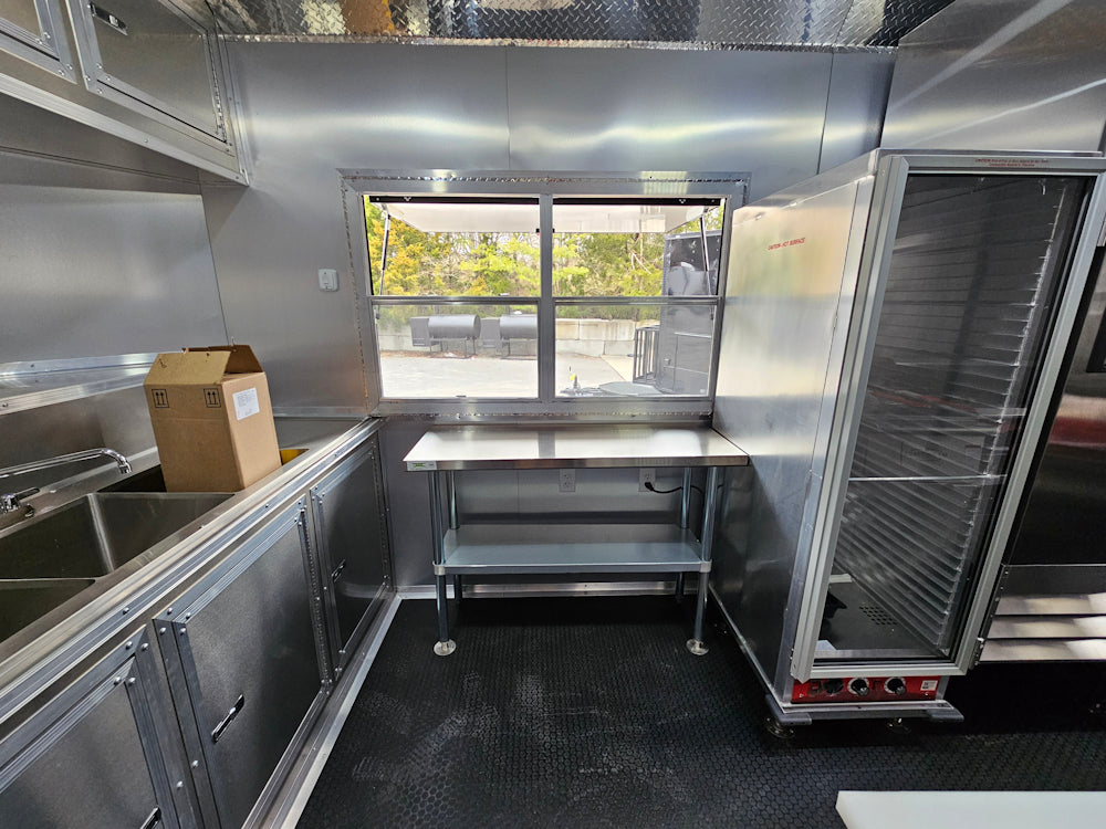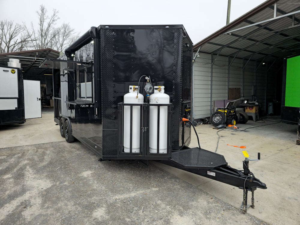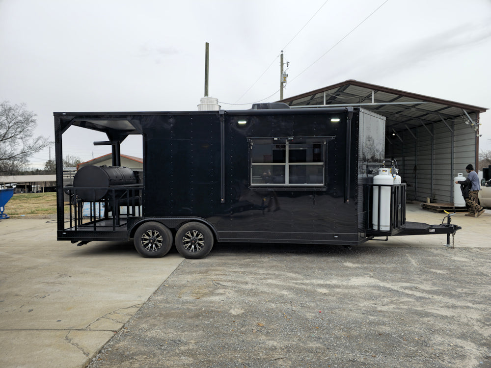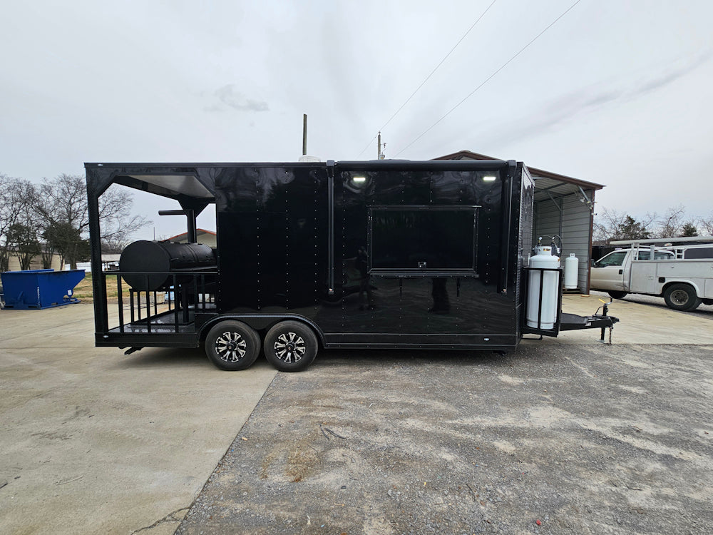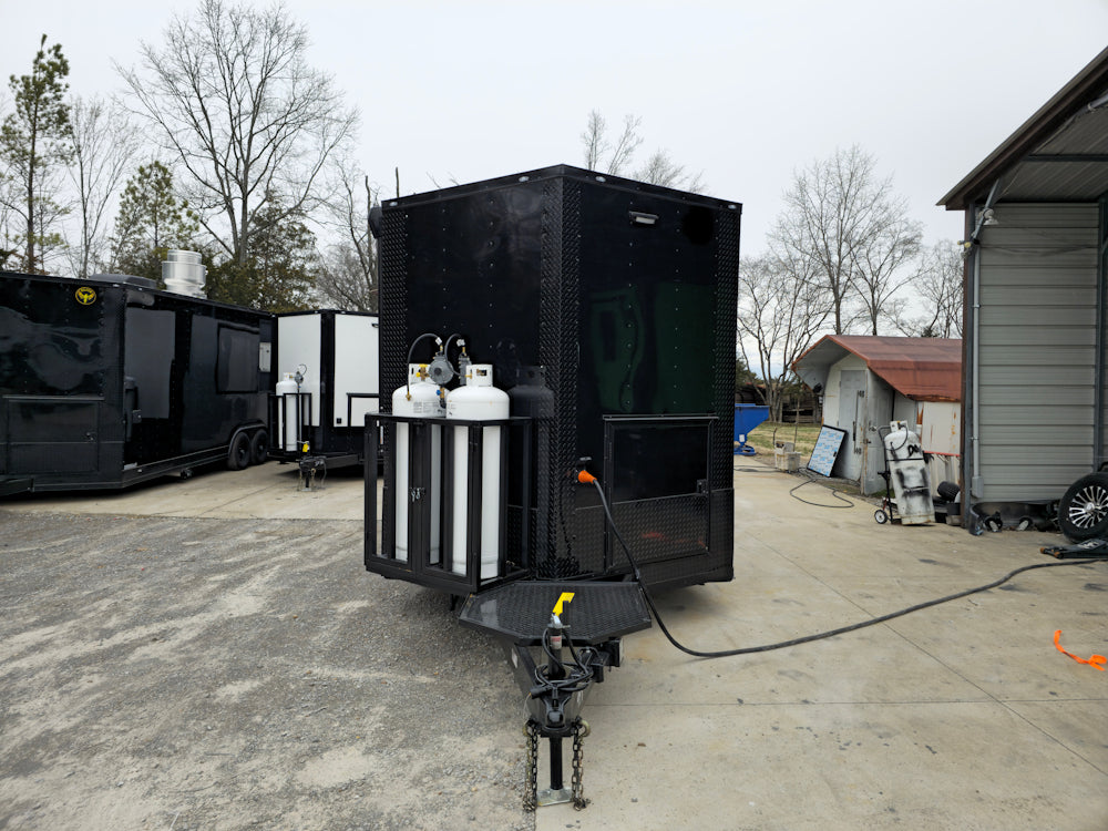 Designed for versatility and performance, this 8.5' x 20' enclosed trailer features a spacious 6' railed porch, premium black exterior, and an 8' interior height for maximum functionality. Equipped with (2) 7,000 lb axles, a 100 Amp electrical system, and a climate-controlled interior, it ensures smooth towing, ample power, and all-weather comfort. Fully loaded with stainless steel countertops, high-end appliances, a 250-gallon smoker, and fire suppression and propane packages, this trailer is the ultimate mobile kitchen or workstation for any professional operation.