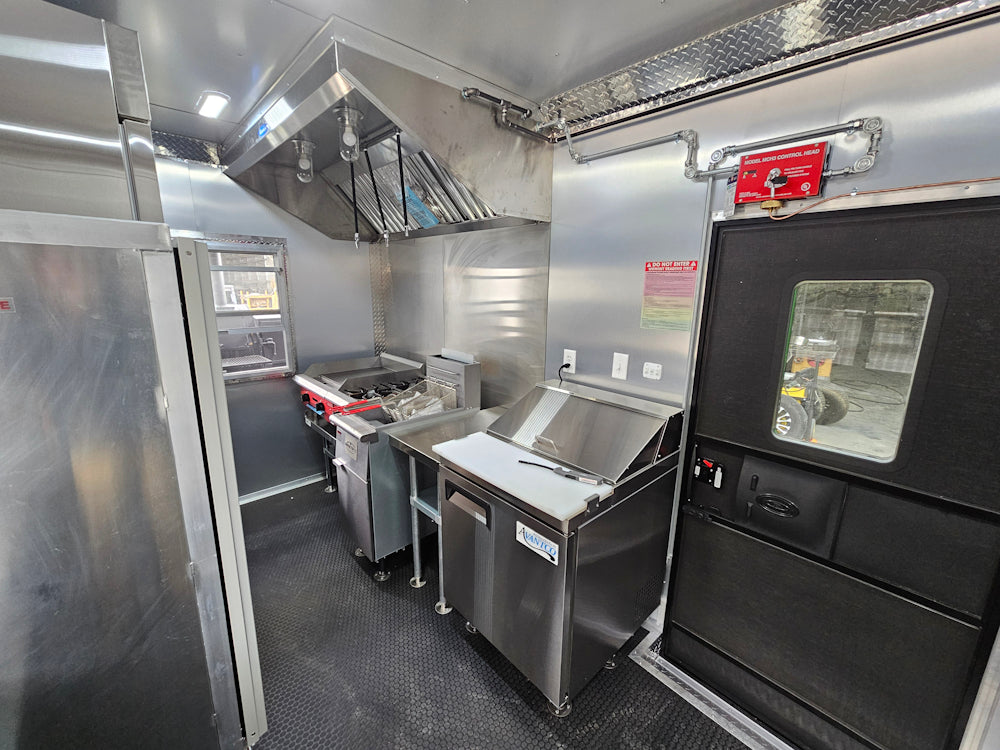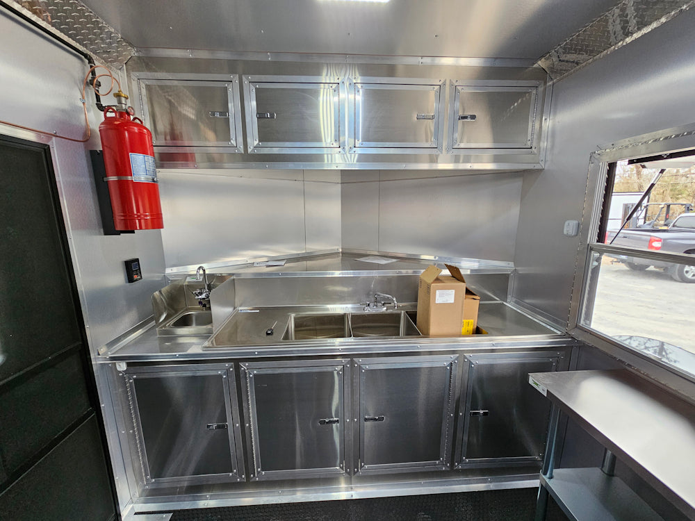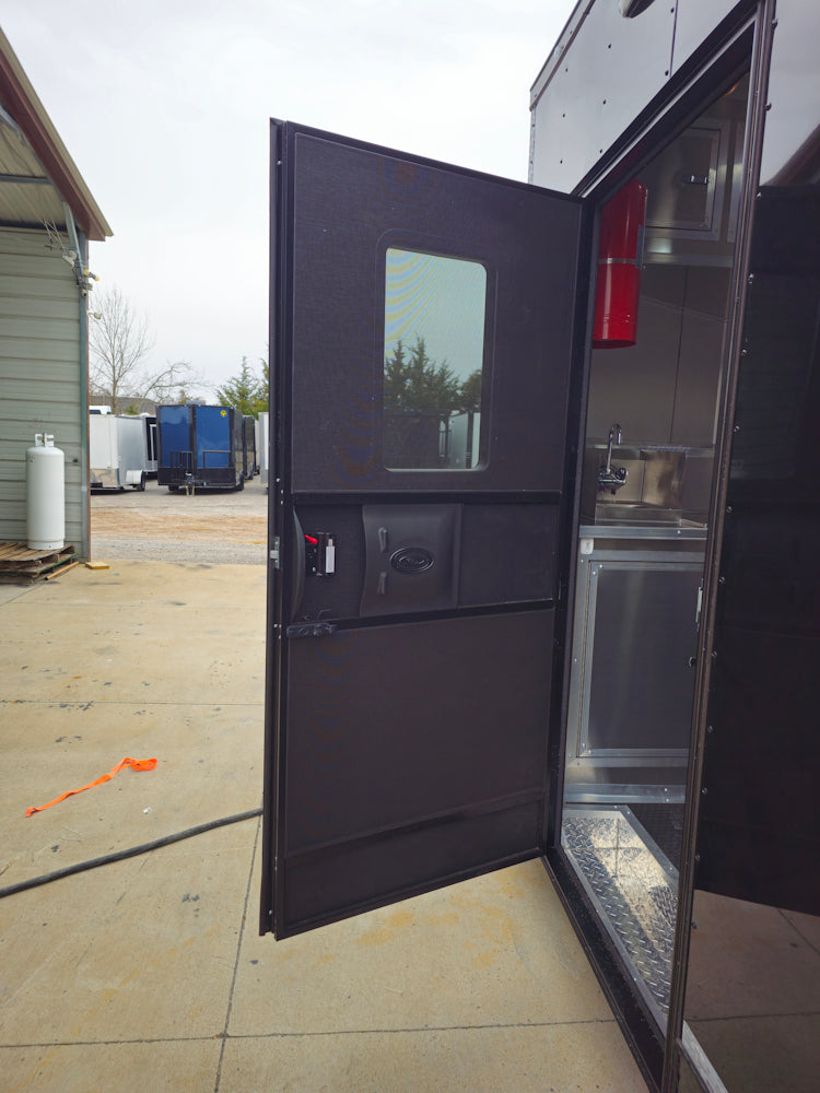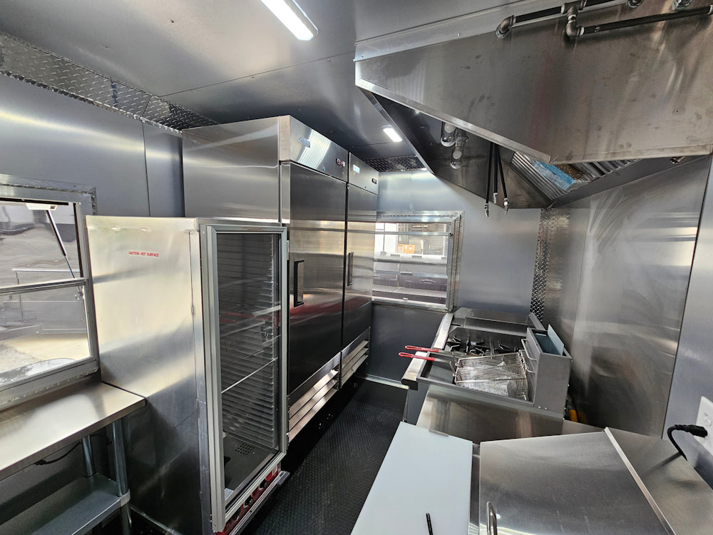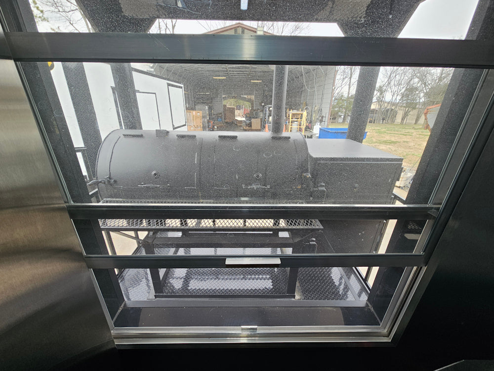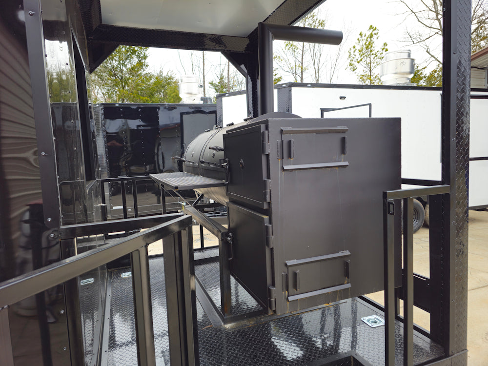 Designed for versatility and performance, this 8.5' x 20' enclosed trailer features a spacious 6' railed porch, premium black exterior, and an 8' interior height for maximum functionality. Equipped with (2) 7,000 lb axles, a 100 Amp electrical system, and a climate-controlled interior, it ensures smooth towing, ample power, and all-weather comfort. Fully loaded with stainless steel countertops, high-end appliances, a 250-gallon smoker, and fire suppression and propane packages, this trailer is the ultimate mobile kitchen or workstation for any professional operation.