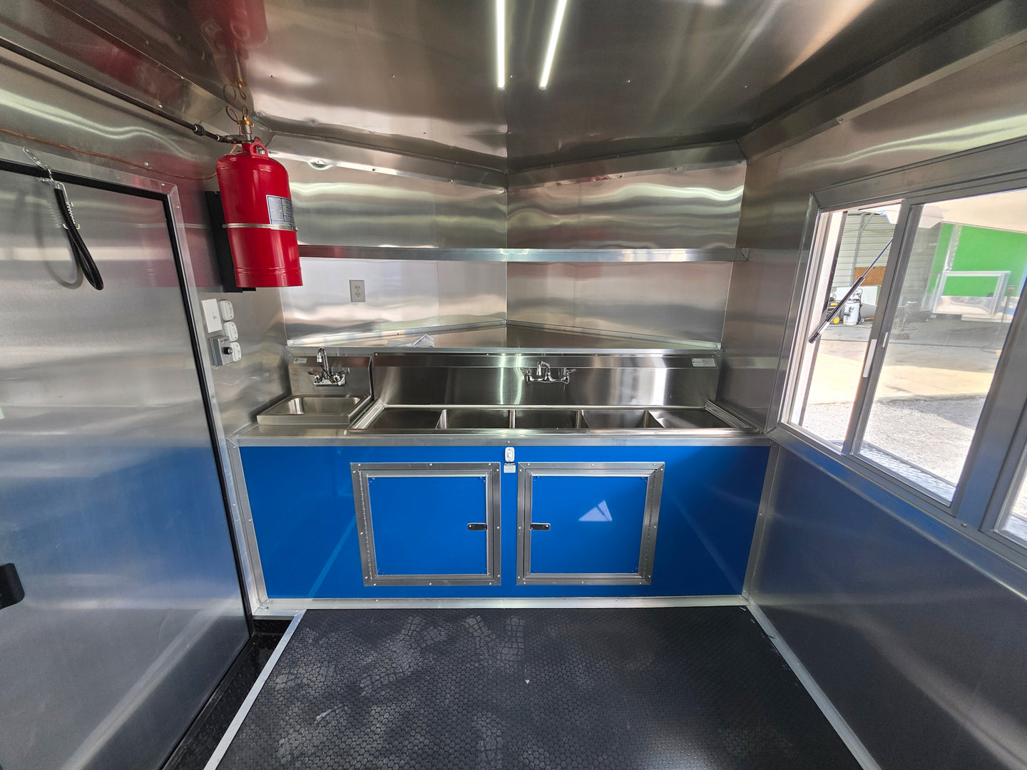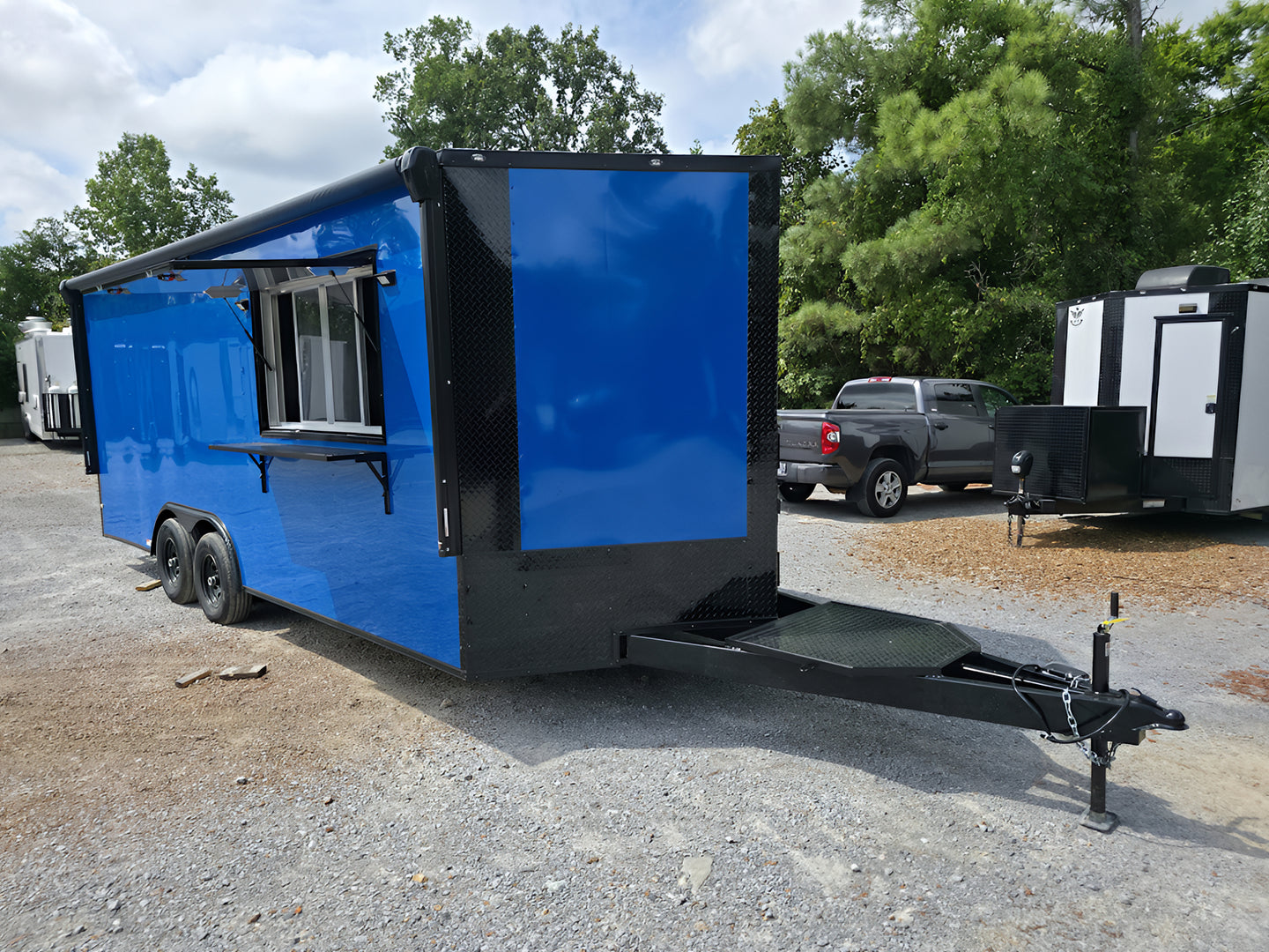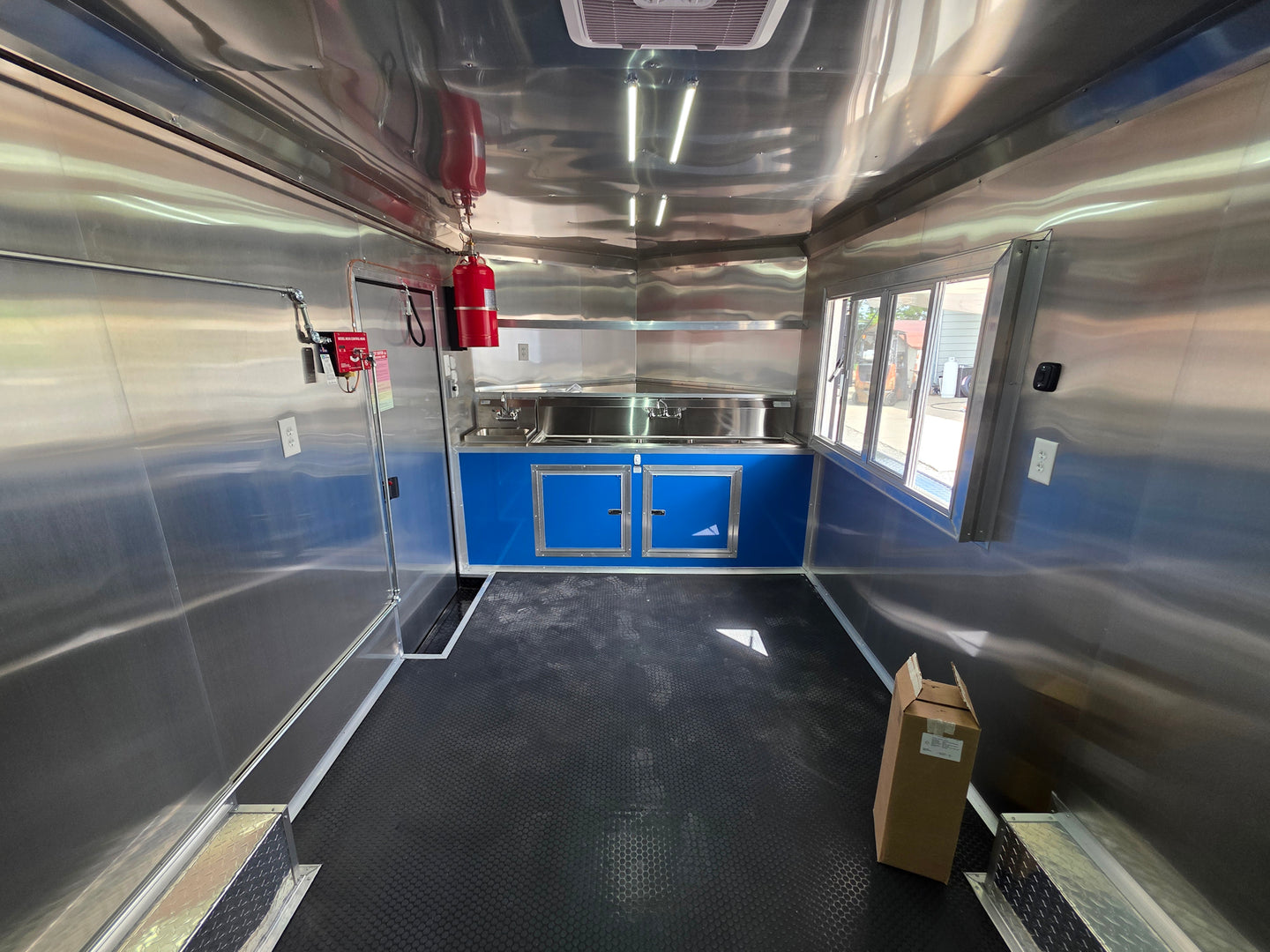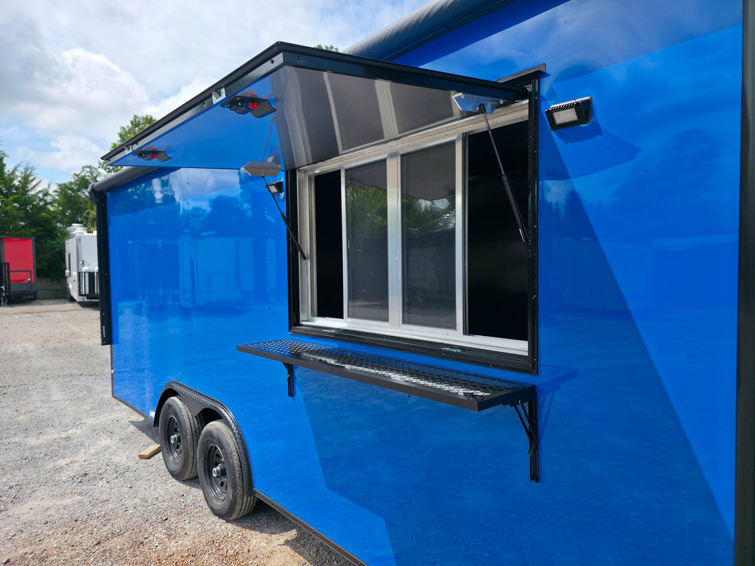 The 8.5’ x 20’ Cobalt Blue Concession Trailer is a fully equipped mobile kitchen designed for food service, events, and catering. Featuring a bold cobalt blue exterior with blackout trim, spacious 7.5’ interior height, stainless steel counters, and a large 5’ serving window, it’s built for both style and efficiency. Complete with a sink package, grease hood, propane setup, fire suppression system, and powerful electrical package, this trailer is ready to handle high-volume operations with ease.