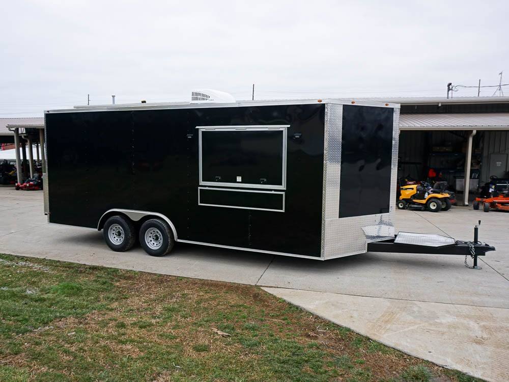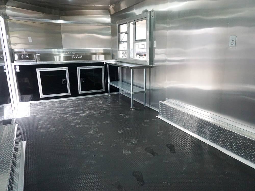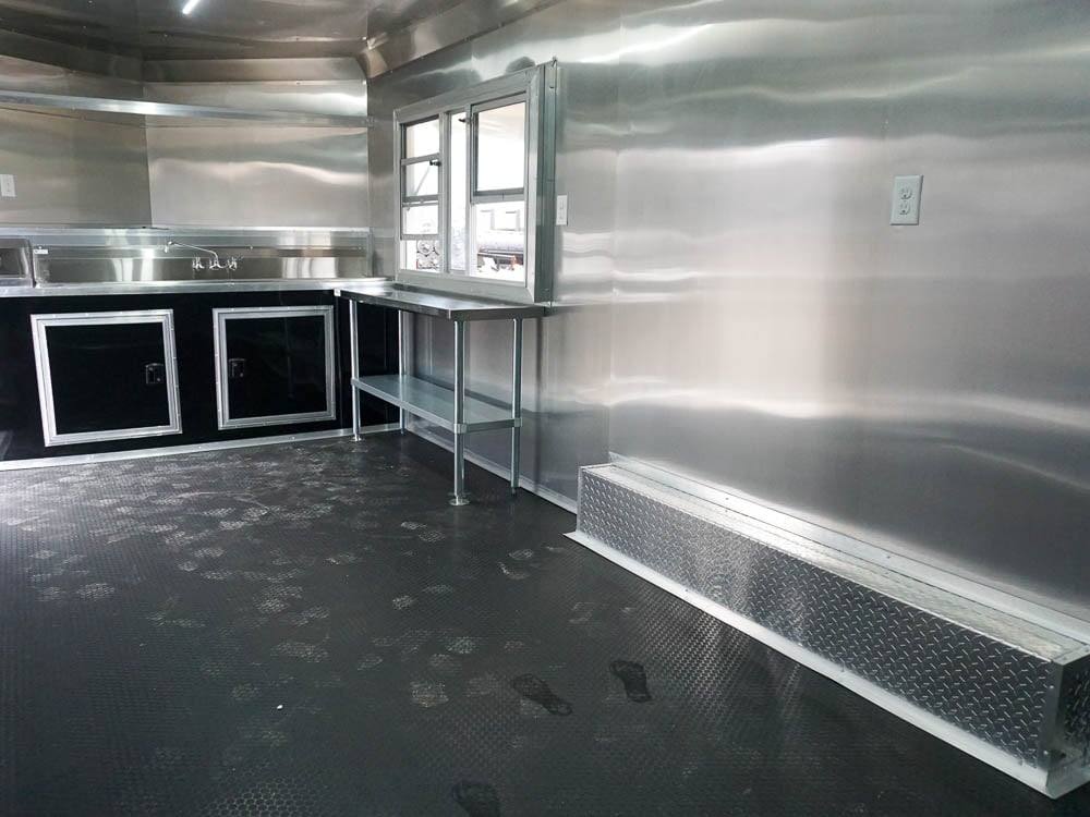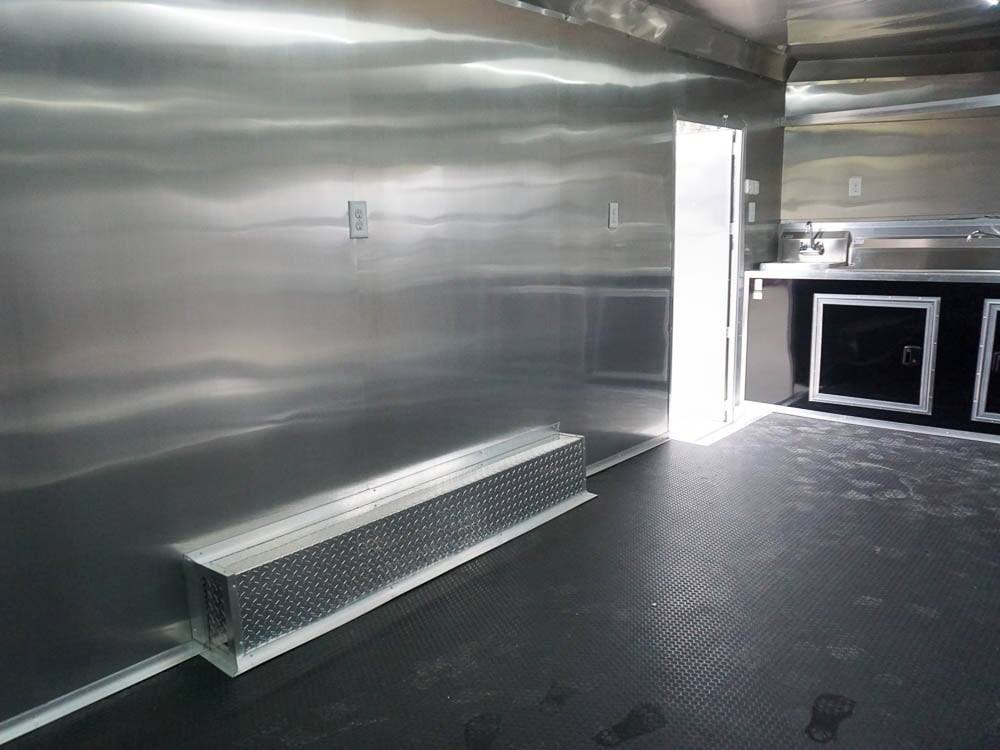 This concession trailer is a simple concession trailer with sink package, A/C & heat, 100 amp electrical package, 5-foot concession window, Rubber flooring, insulated walls, and ceiling, aluminum mill finish walls, and ceiling at an affordable price.
