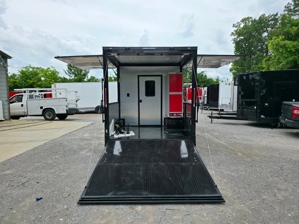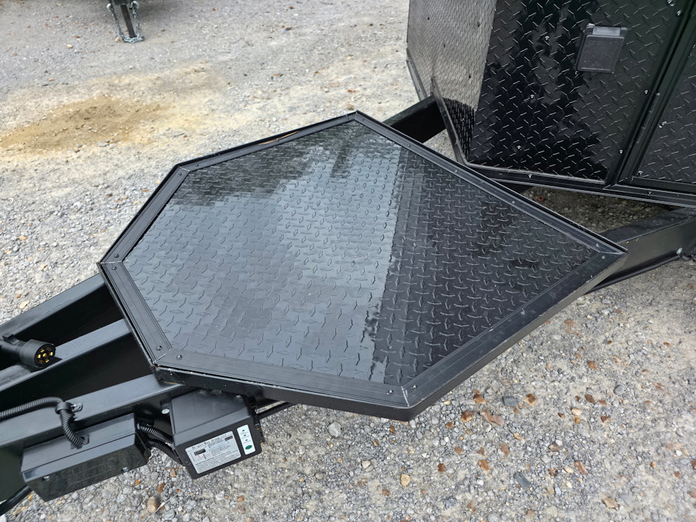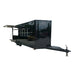 • 8' Rear Porch: Includes 36" knee walls on both sides, flip-up doors above for weather protection and service access, and a rear ramp door with crank jack supports that doubles as an extended platform