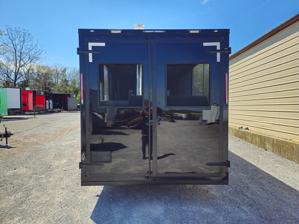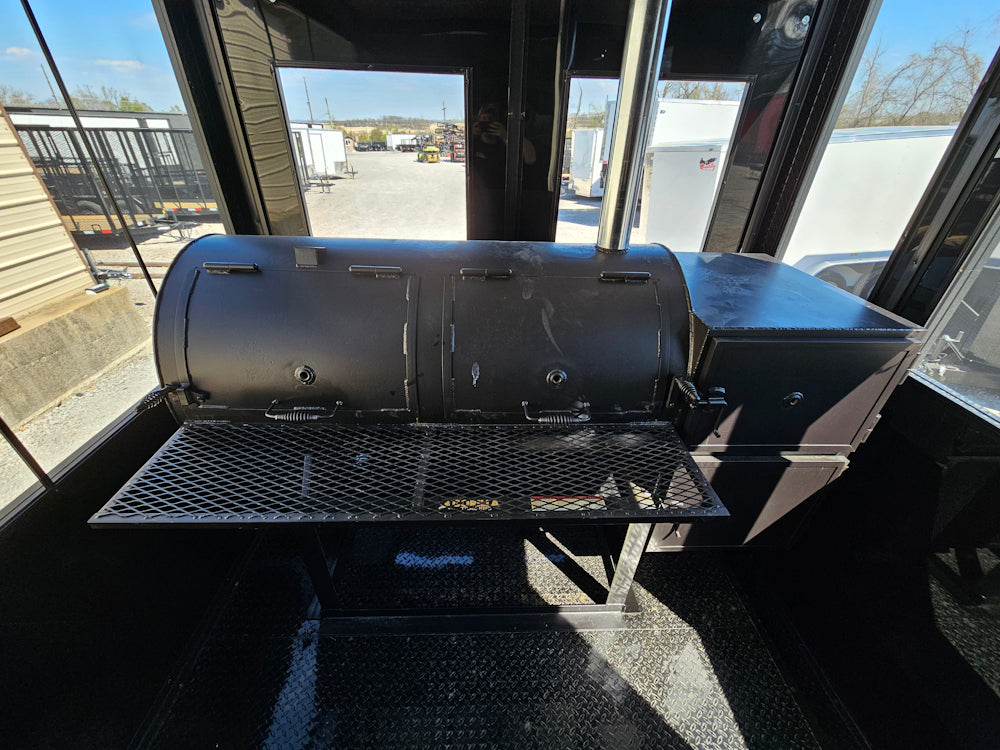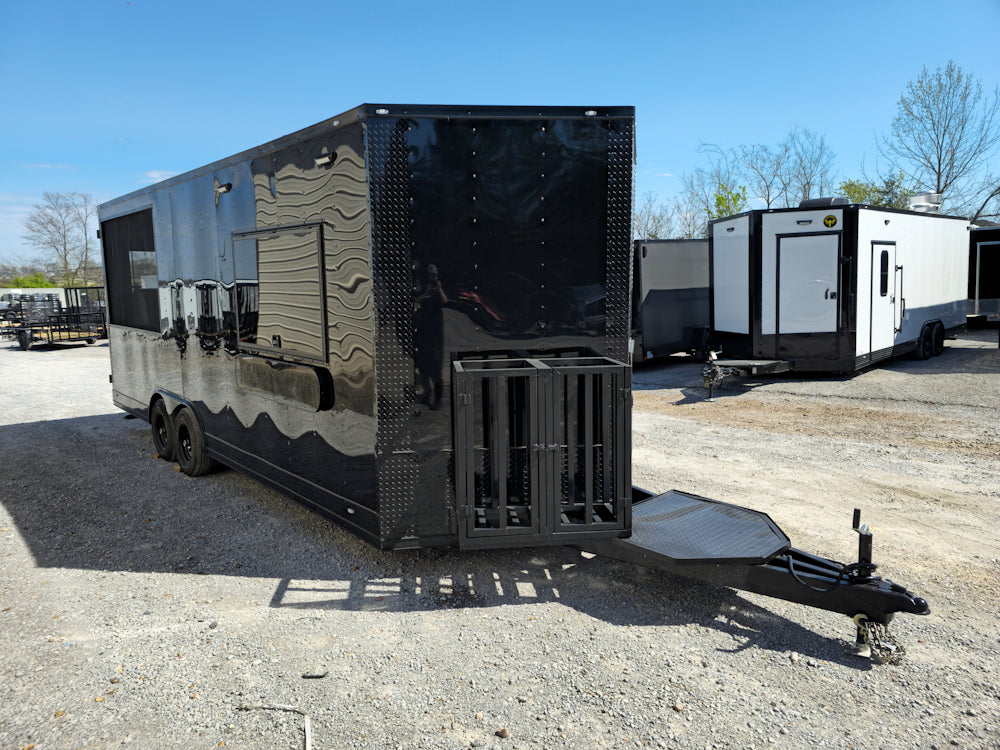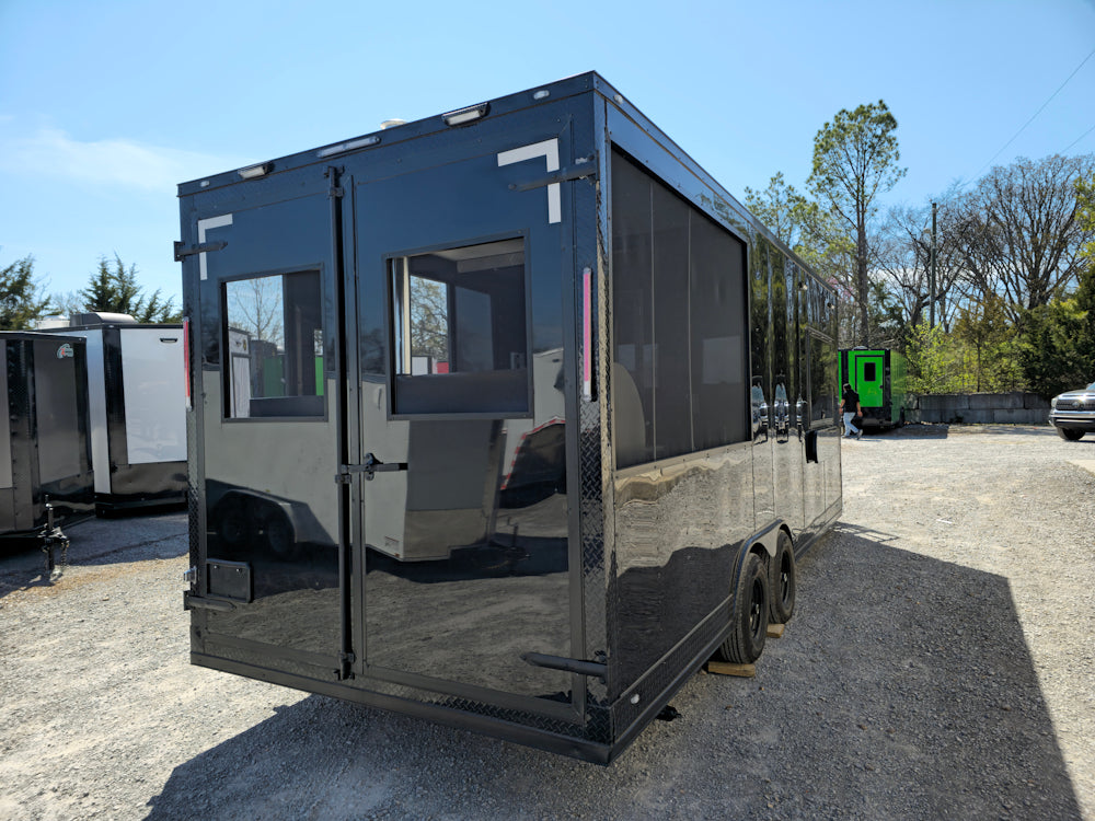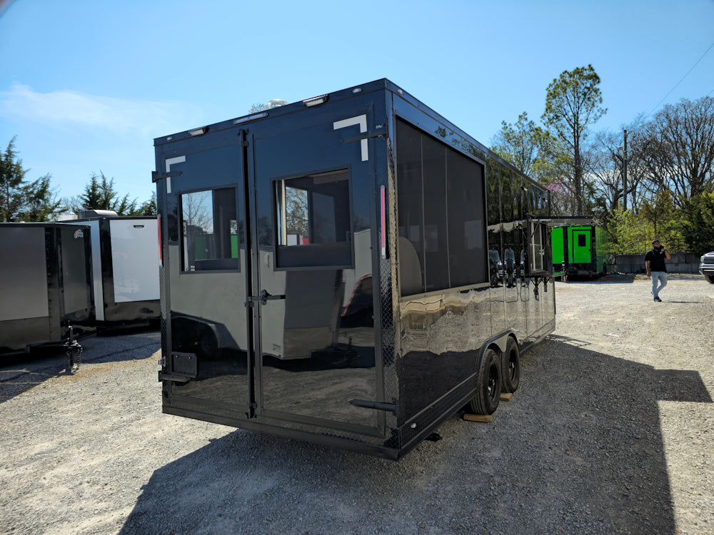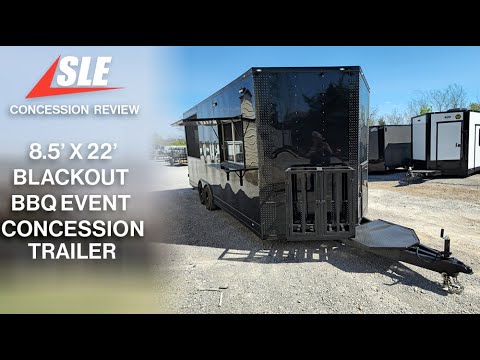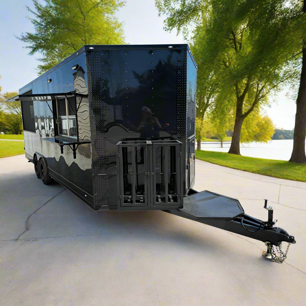 The 8.5' x 22' Black With Blackout Concession Trailer is designed for high-performance BBQ catering, featuring an 8' screened porch with barn doors, perfect for outdoor cooking. Its spacious interior with 8' height, 100-amp electrical package, and A/C & heat package ensure a comfortable and efficient workspace. With heavy-duty dual 5,200lb axles, a 6' x 3' grease hood, and dual 100lb propane cages, this trailer is built for professional, on-the-go BBQ operations.