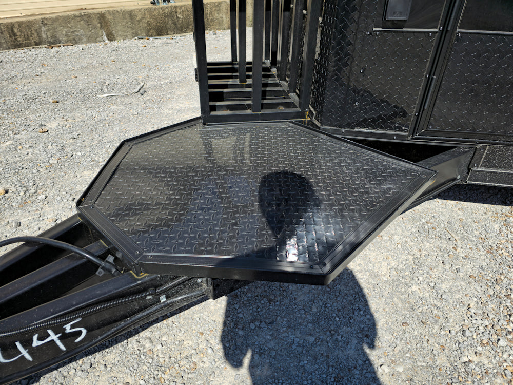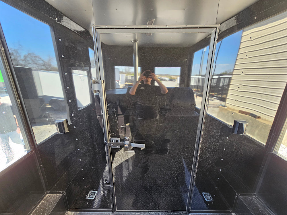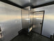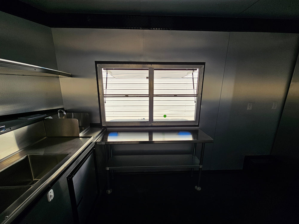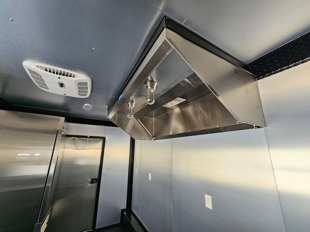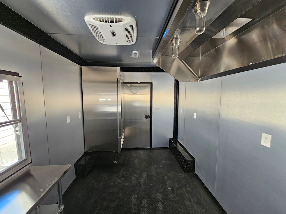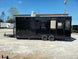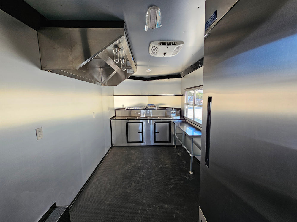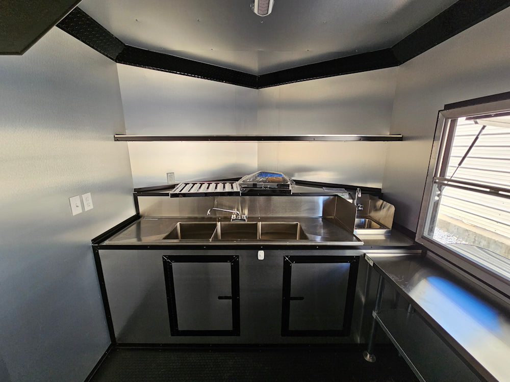 The 8.5' x 22' Black With Blackout Concession Trailer is designed for high-performance BBQ catering, featuring an 8' screened porch with barn doors, perfect for outdoor cooking. Its spacious interior with 8' height, 100-amp electrical package, and A/C & heat package ensure a comfortable and efficient workspace. With heavy-duty dual 5,200lb axles, a 6' x 3' grease hood, and dual 100lb propane cages, this trailer is built for professional, on-the-go BBQ operations.