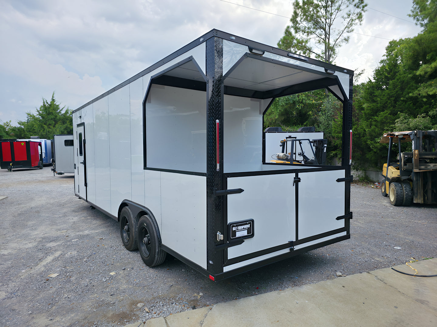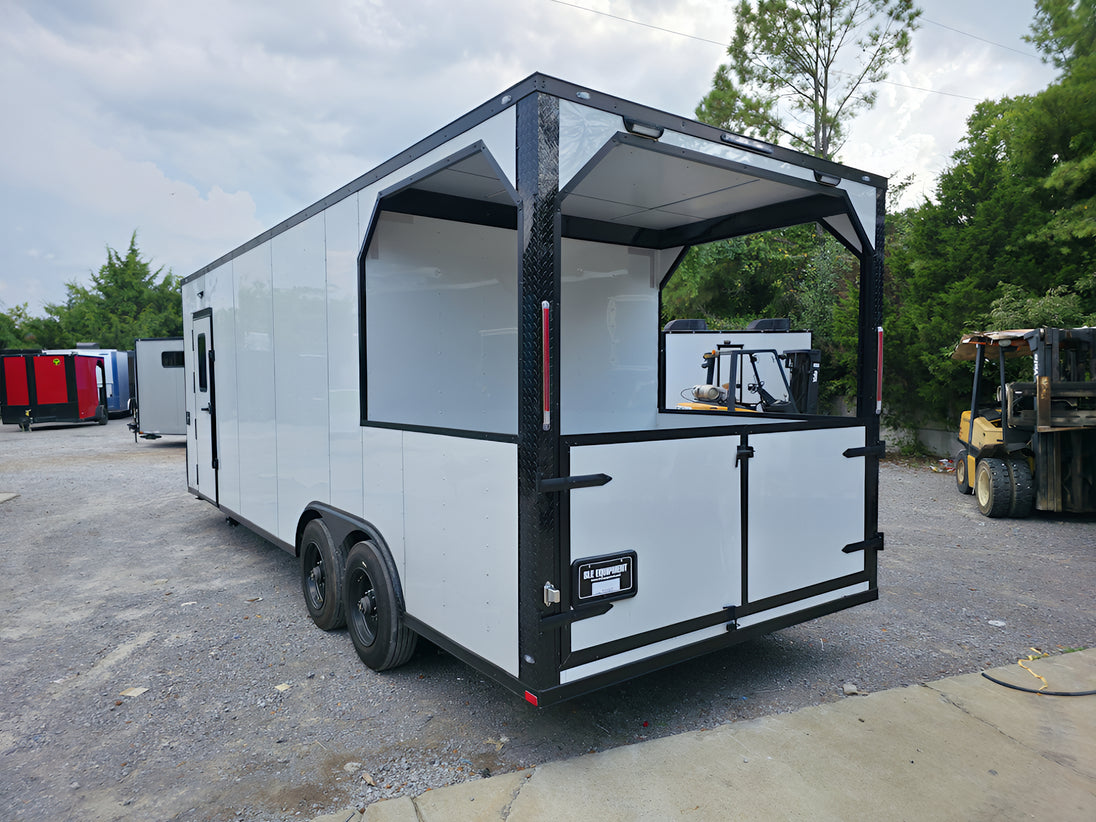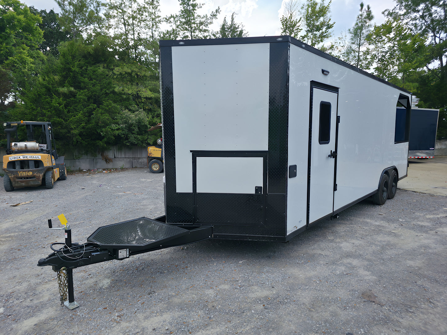 • Spacious 8.5' x 24' trailer design with a functional 6' porch, featuring half walls on each side and a barn door-style half wall on the rear for flexible use