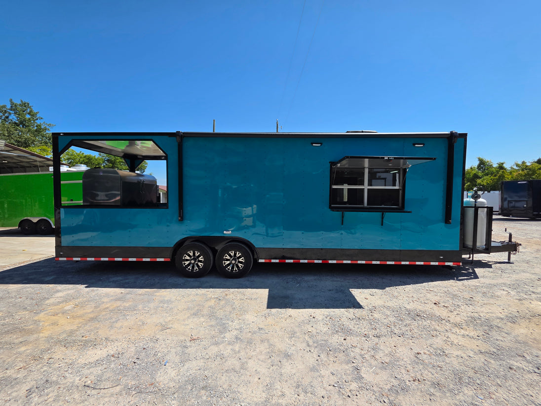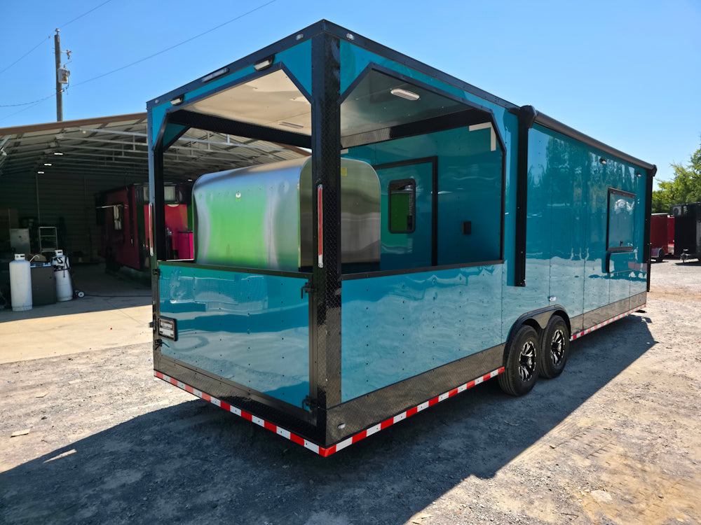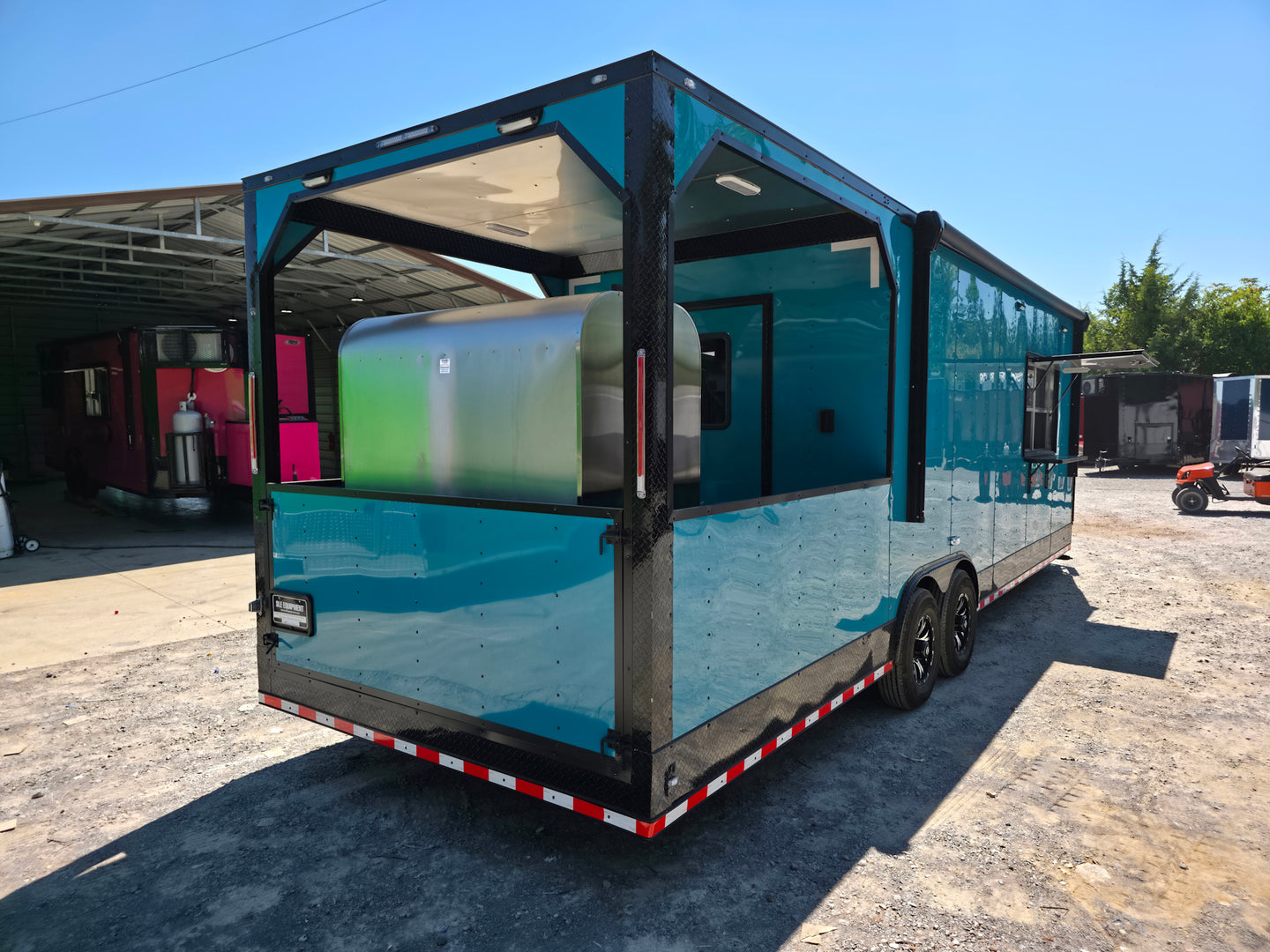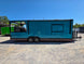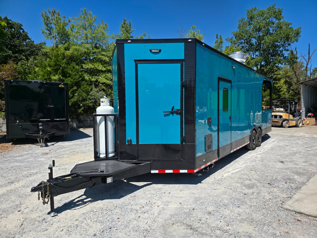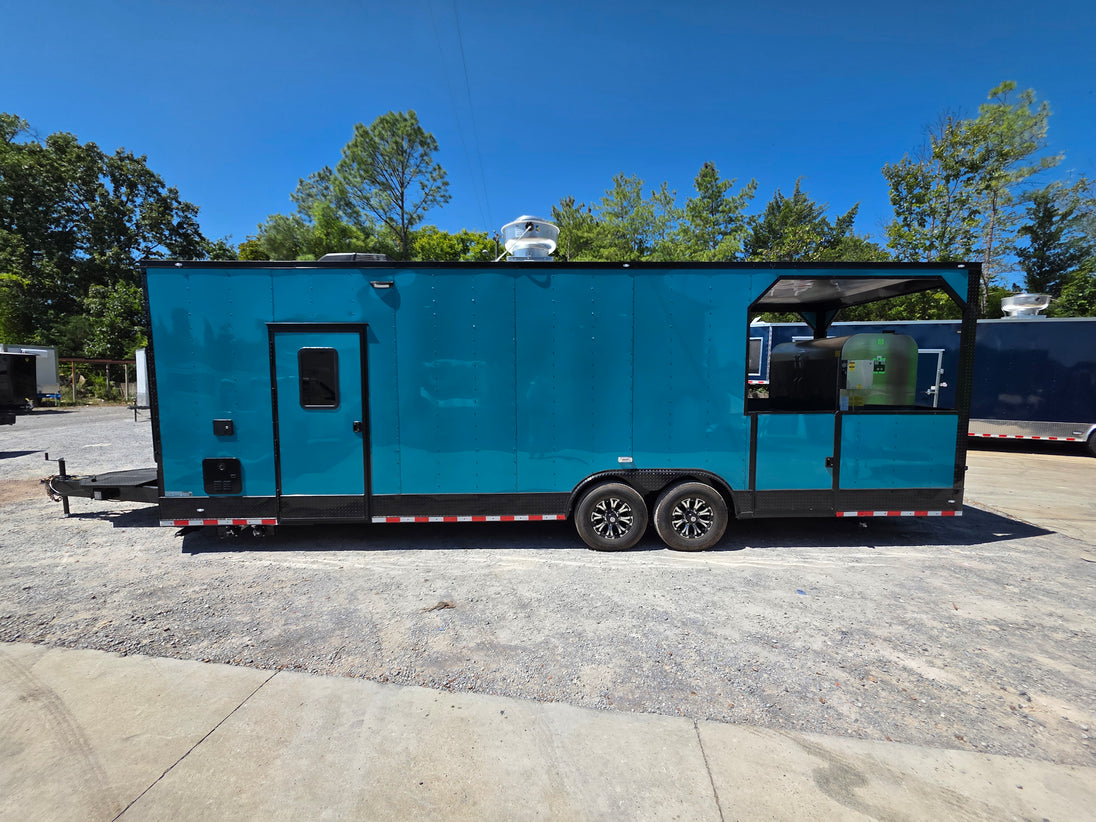 The 8.5’ x 28’ Teal Green Custom Concession Trailer combines bold style with a spacious, fully equipped layout built for food, events, and catering. Featuring an 8’ interior height, rear porch, stainless steel counters, full sink and bathroom packages, plus a commercial grease hood with grease trap, it’s designed for professional cooking and smooth operations. With A/C and heat, LED lighting, ample storage, and a striking teal exterior with blackout trim, this trailer is ready to impress and perform at any event.