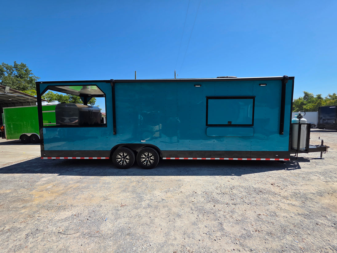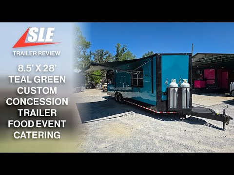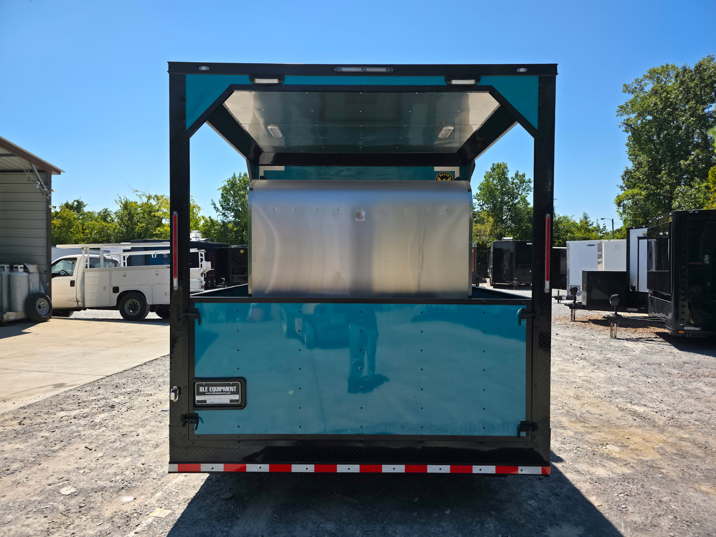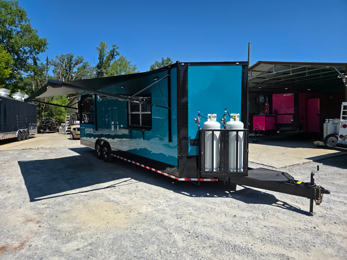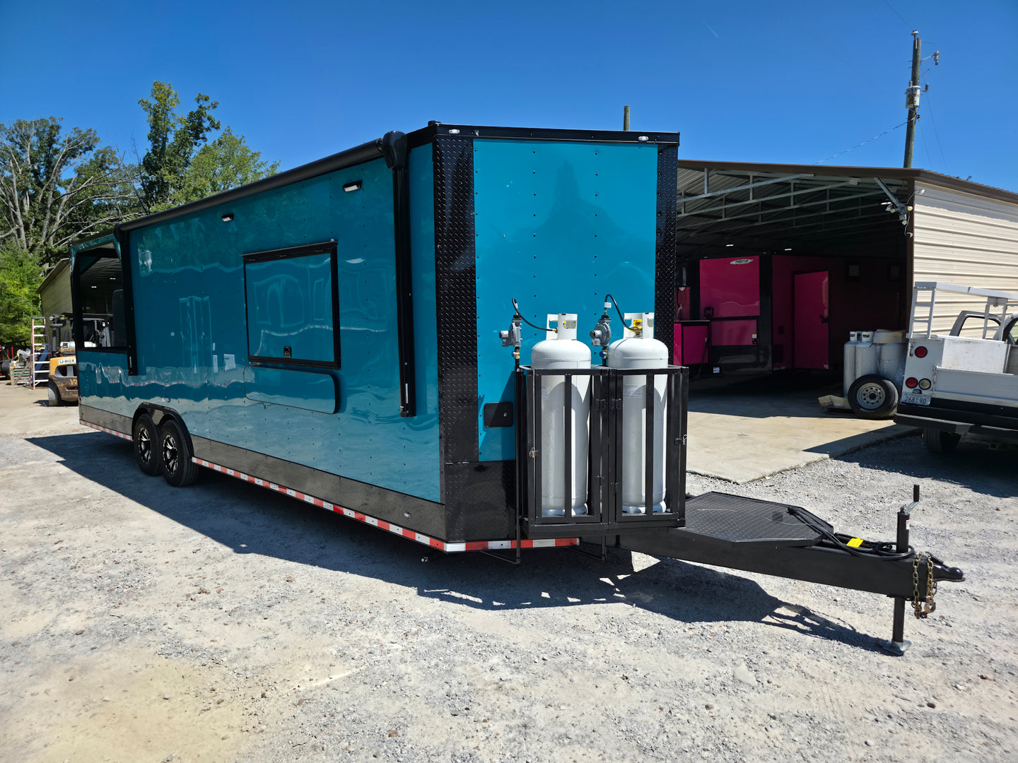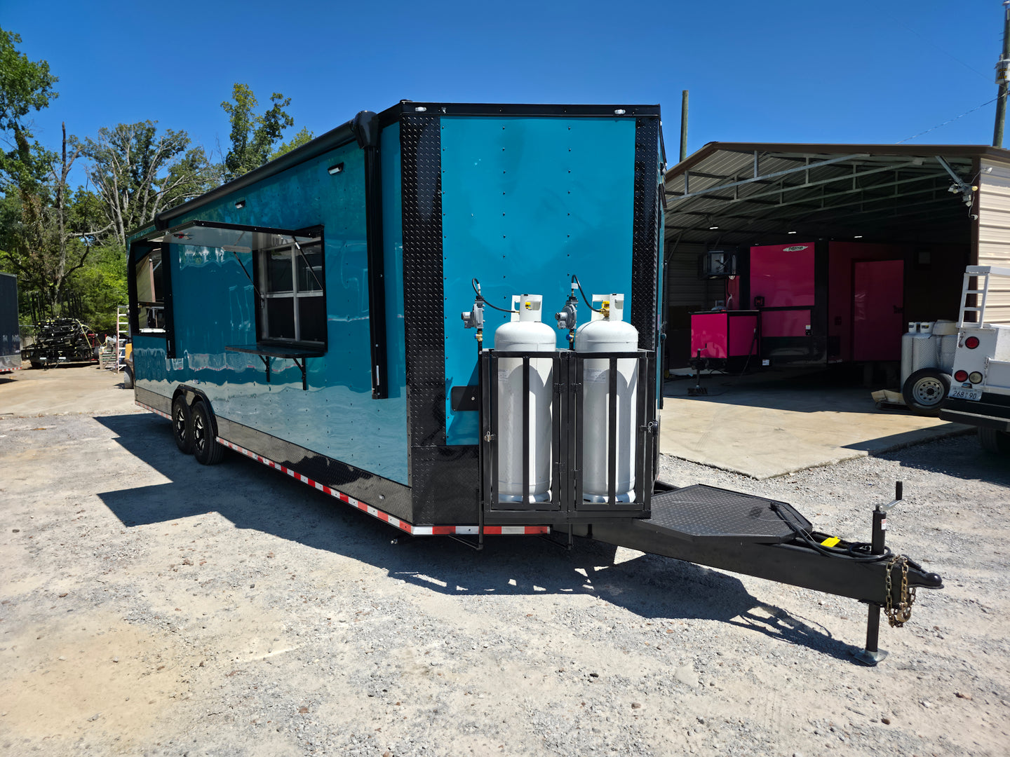 The 8.5’ x 28’ Teal Green Custom Concession Trailer combines bold style with a spacious, fully equipped layout built for food, events, and catering. Featuring an 8’ interior height, rear porch, stainless steel counters, full sink and bathroom packages, plus a commercial grease hood with grease trap, it’s designed for professional cooking and smooth operations. With A/C and heat, LED lighting, ample storage, and a striking teal exterior with blackout trim, this trailer is ready to impress and perform at any event.