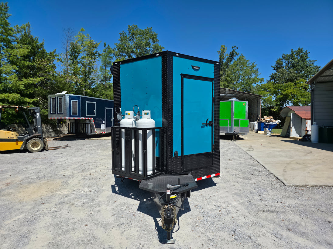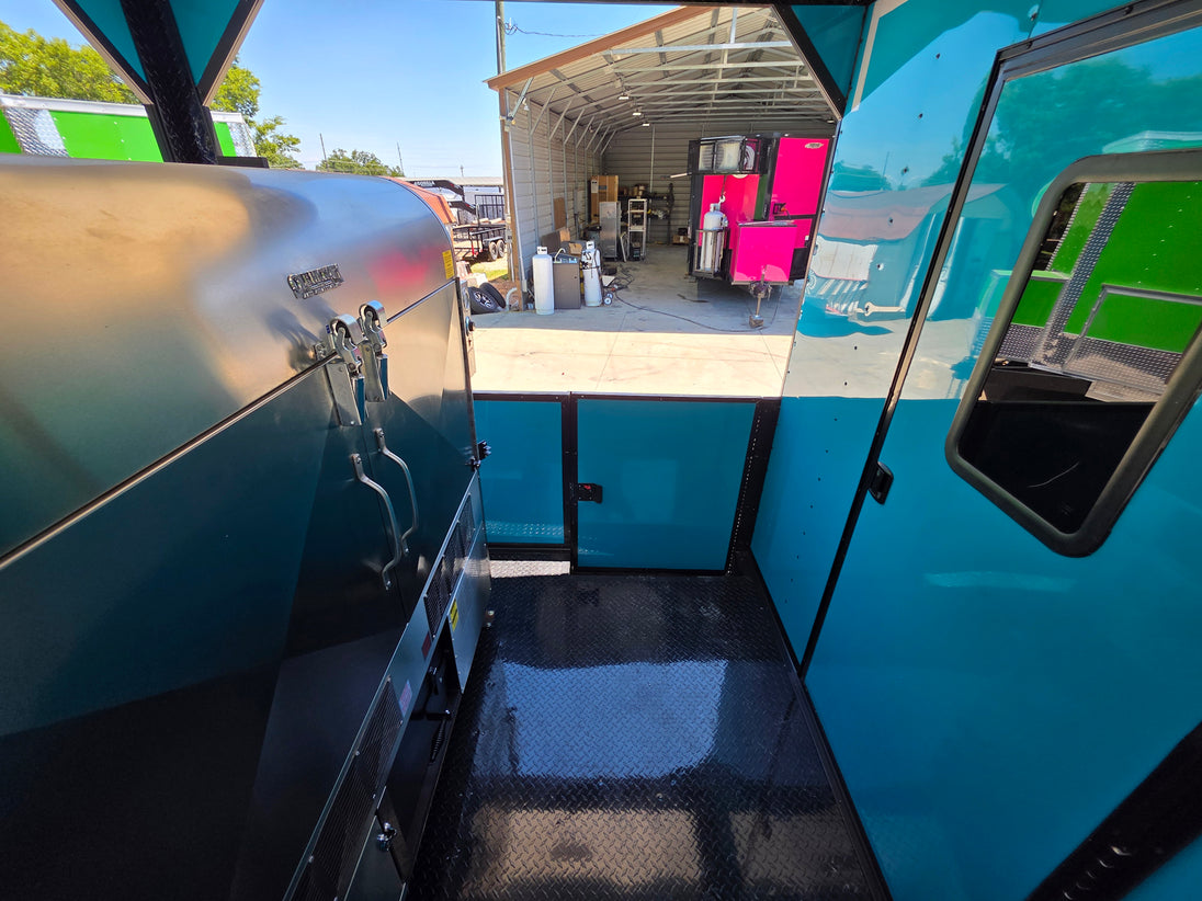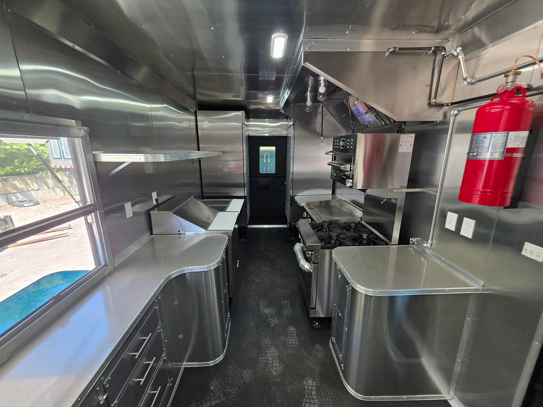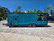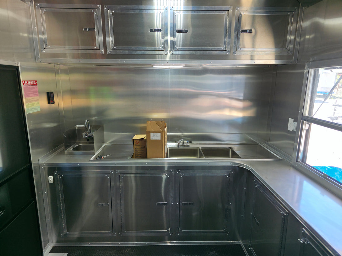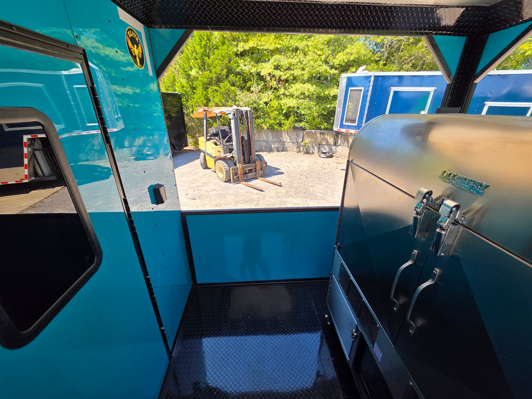 The 8.5’ x 28’ Teal Green Custom Concession Trailer combines bold style with a spacious, fully equipped layout built for food, events, and catering. Featuring an 8’ interior height, rear porch, stainless steel counters, full sink and bathroom packages, plus a commercial grease hood with grease trap, it’s designed for professional cooking and smooth operations. With A/C and heat, LED lighting, ample storage, and a striking teal exterior with blackout trim, this trailer is ready to impress and perform at any event.
