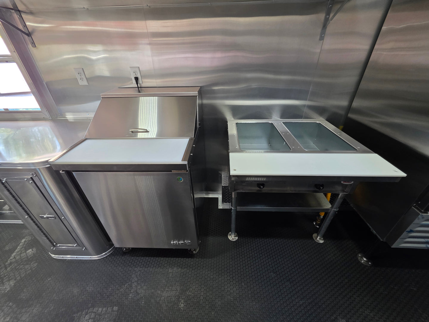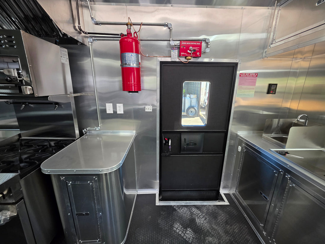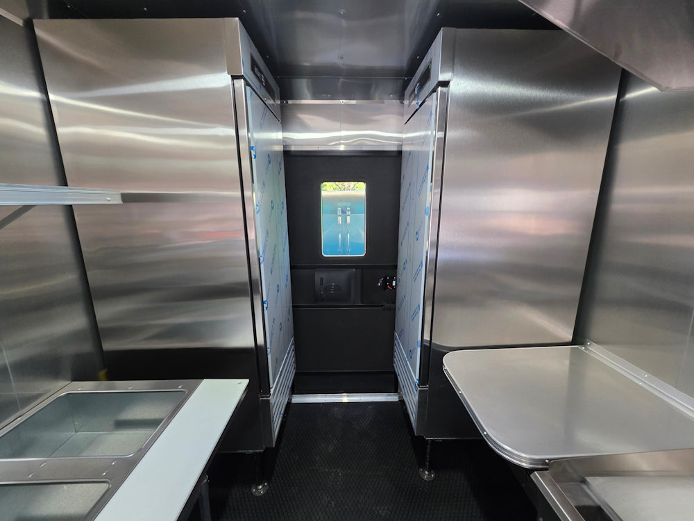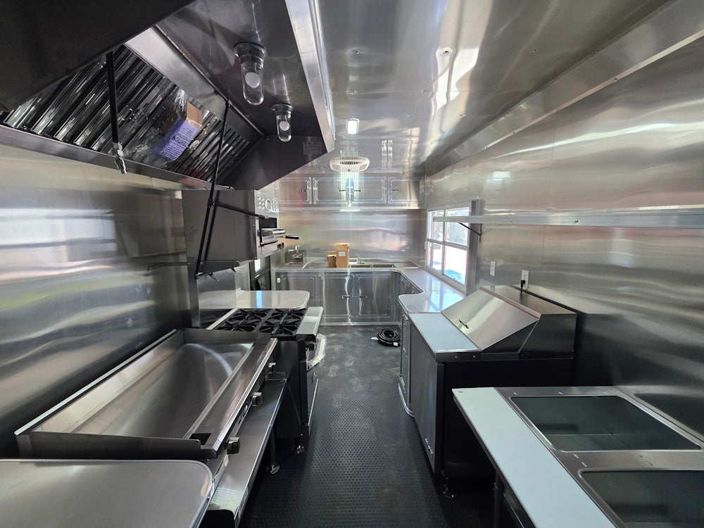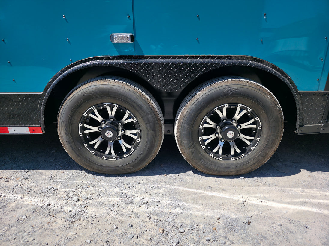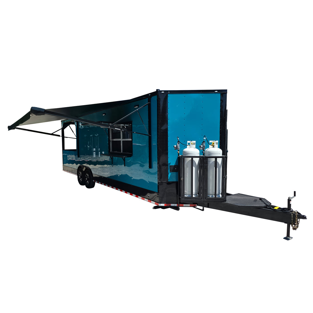 The 8.5’ x 28’ Teal Green Custom Concession Trailer combines bold style with a spacious, fully equipped layout built for food, events, and catering. Featuring an 8’ interior height, rear porch, stainless steel counters, full sink and bathroom packages, plus a commercial grease hood with grease trap, it’s designed for professional cooking and smooth operations. With A/C and heat, LED lighting, ample storage, and a striking teal exterior with blackout trim, this trailer is ready to impress and perform at any event.