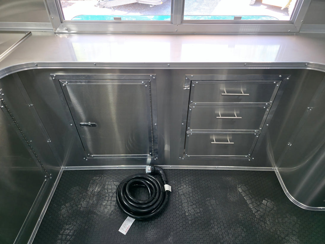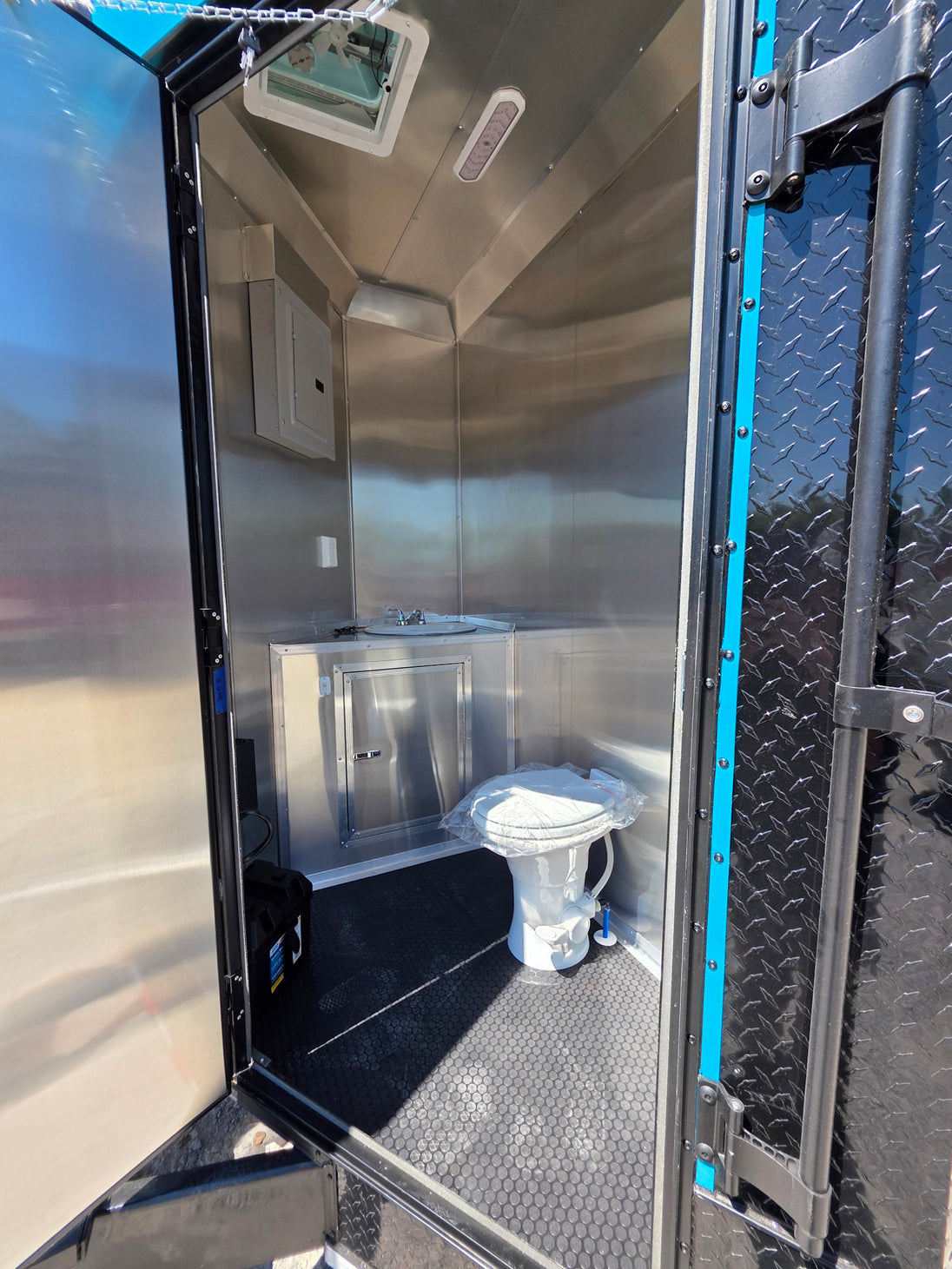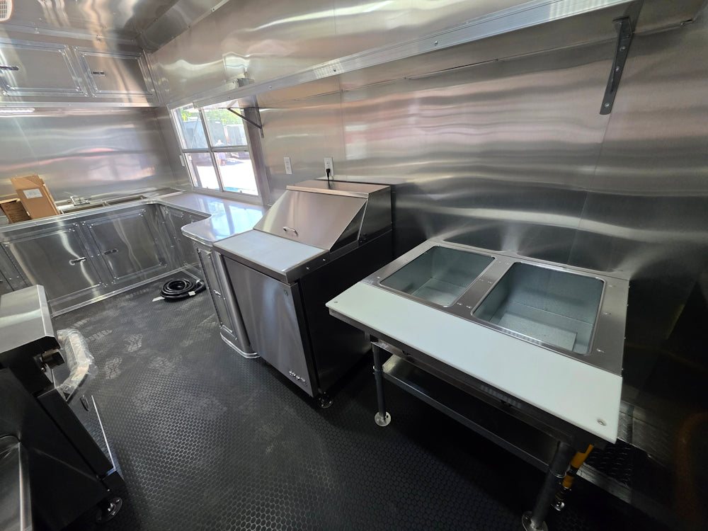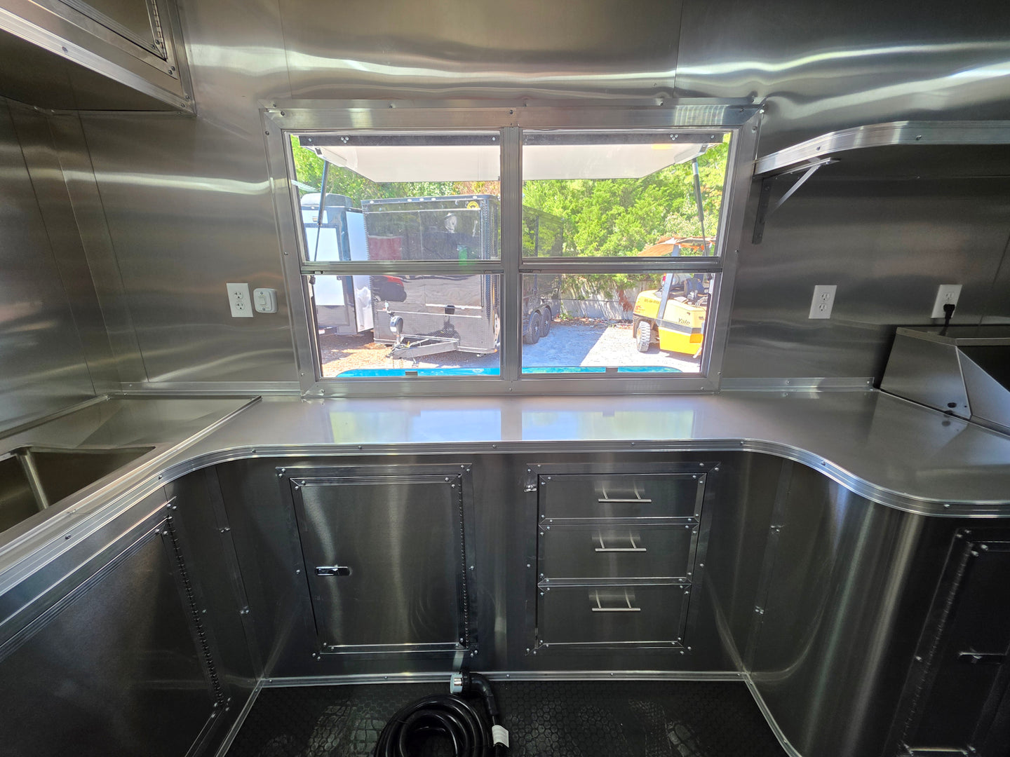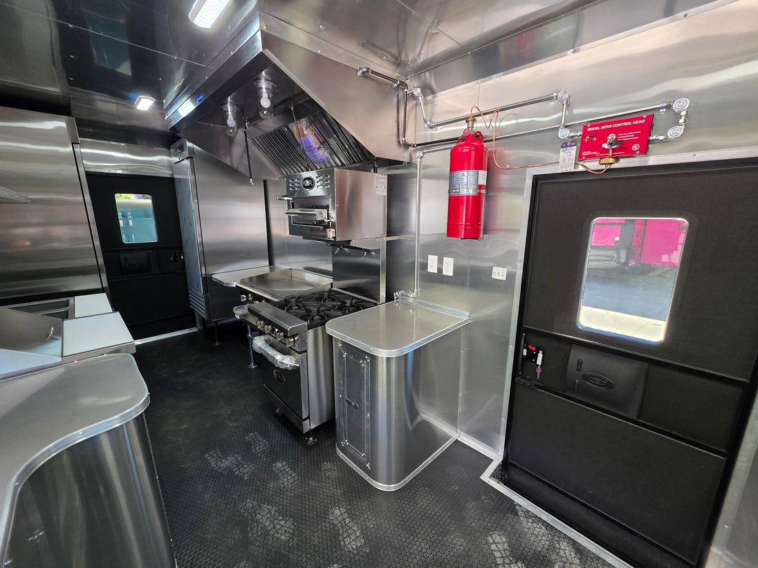 The 8.5’ x 28’ Teal Green Custom Concession Trailer combines bold style with a spacious, fully equipped layout built for food, events, and catering. Featuring an 8’ interior height, rear porch, stainless steel counters, full sink and bathroom packages, plus a commercial grease hood with grease trap, it’s designed for professional cooking and smooth operations. With A/C and heat, LED lighting, ample storage, and a striking teal exterior with blackout trim, this trailer is ready to impress and perform at any event.
