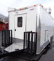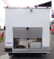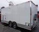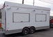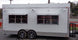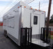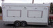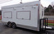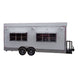 This is a custom food concession trailer in white, measuring 8.5 ft by 20 ft and featuring a 6 ft concession window, 6 ft commercial grease hood, a 2 ft by 5 ft flip up under sink access door.