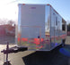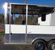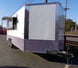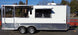 Custom concession trailer in white that measures 8.5 ft. by 20 ft. It features 5 ft. food window, cabinet and shelf package, open porch, and more.