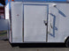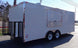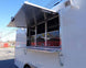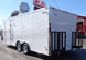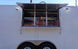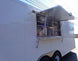 This is a custom built concession trailer in white and measures 8.5 ft by 20 ft. It includes a 10 ft commercial grease hood, a 6 ft concession window with a flip up counter, sink package and cabinet and shelf package.