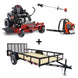 This package includes a 54-inch Toro Titan MyRIDE (75315) zero-turn mower with a 26-horsepower Kohler engine, one Husqvarna 130BT backpack blower, one 128LD straight-shaft string trimmer, and a 6.4-foot by 12-foot utility trailer.