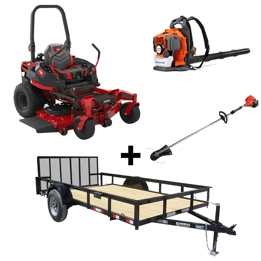 This package includes a 60-inch ZMaster 2000 (77285) Zero Turn Mower powered by a 24.5-horsepower Toro V-Twin 708cc engine, one Husqvarna 130BT backpack blower, one 128LD straight-shaft string trimmer, and a 6.4x12 utility trailer.