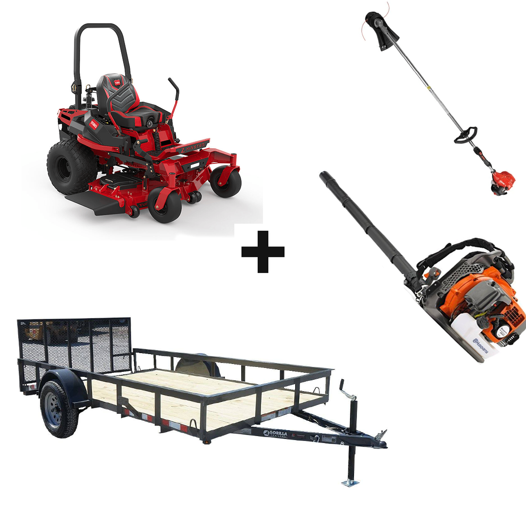 -1%This package deal includes a Toro 77291 52" ZMaster MyRIDE Zero Turn Mower 23.5HP KAW, a 5x10 Dovetail Utility Trailer 3,500lb Axle, a 150BT Backpack Blower and a SRM-225 Straight Shaft String Trimmer.
