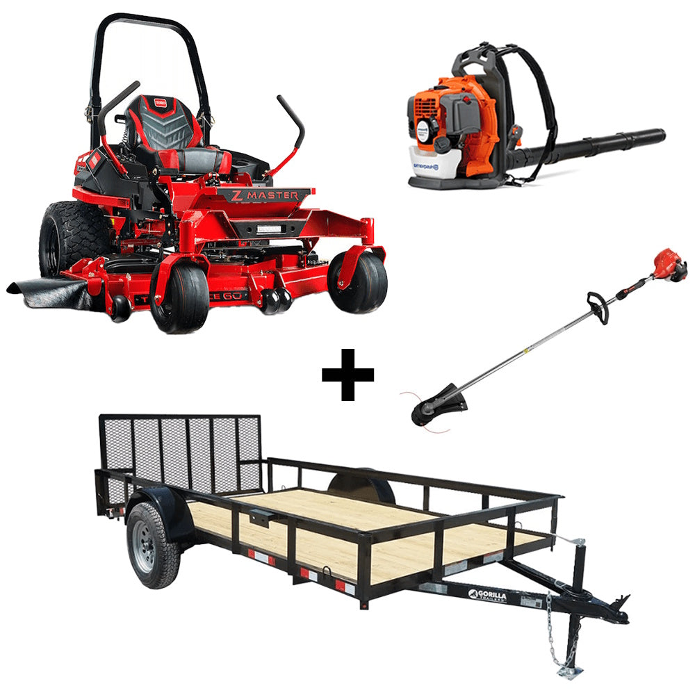 This package includes a 60-inch 2000 Series MyRIDE HDX (77294) Zero Turn Mower with a 23.5-horsepower Kawasaki engine, one Husqvarna 130BT backpack blower, one 128LD straight-shaft string trimmer, and a 6.4x12 utility trailer.
