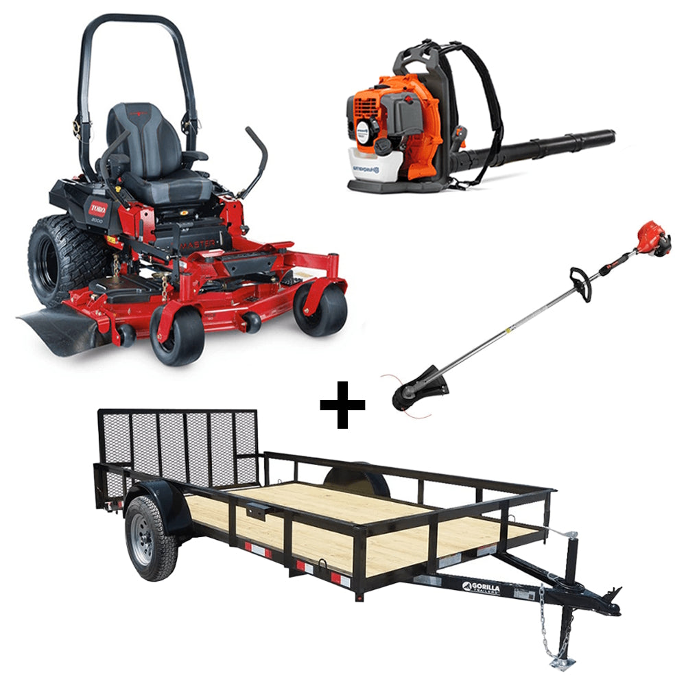 This package includes a 60-inch Toro ZMaster 2000 Series HDX Pro (77299) zero-turn mower with a 24.5-horsepower Kawasaki engine, one Husqvarna 130BT backpack blower, one 128LD straight-shaft string trimmer, and a 7-foot by 12-foot v-nose enclosed trailer.