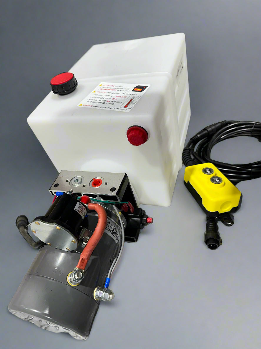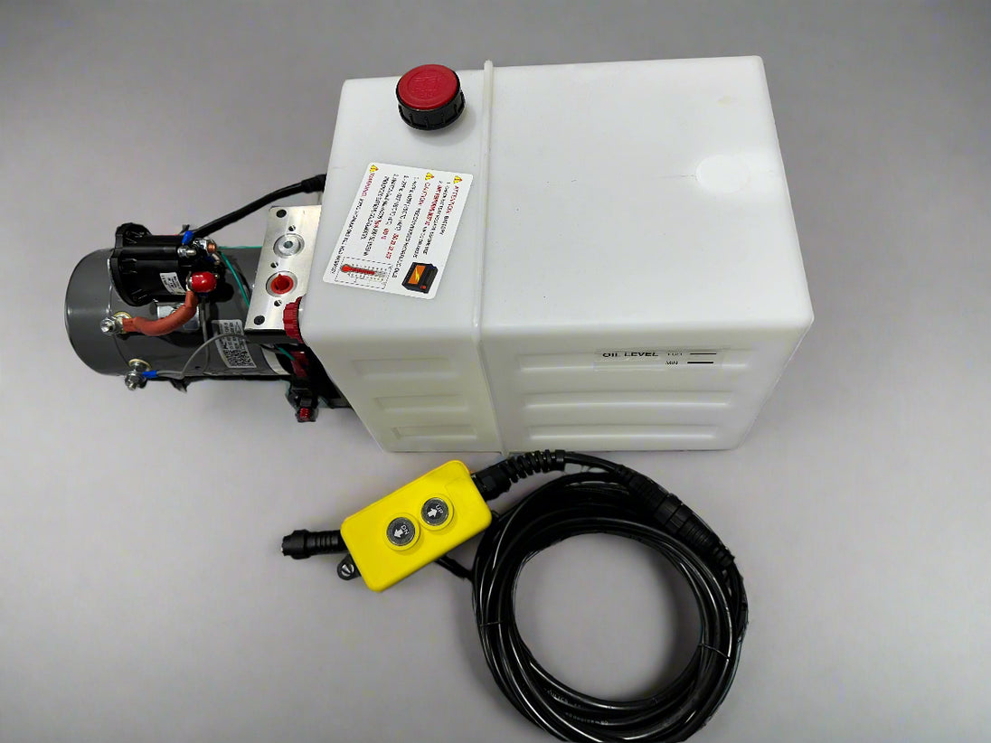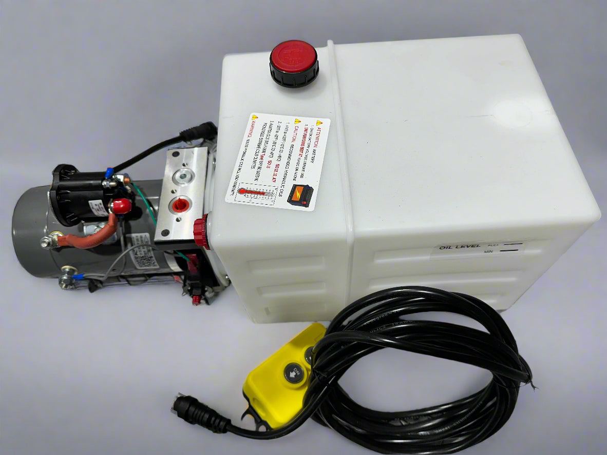 The KTI Single Acting Hydraulic Pump is a 13-quart, 12VDC power unit designed for efficient power-up and gravity-down operation, ideal for dump trailers and heavy-duty tasks. With a 3200 PSI max relief on the A port and a 1500 PSI max on the B port, it offers reliable lifting and controlled lowering. Featuring a translucent reservoir, easy installation, and a handheld pendant for remote operation, this pump ensures maximum performance and convenience.