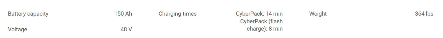 • Charging times: CyberPack: 14 minCyberPack (flash charge): 8 min