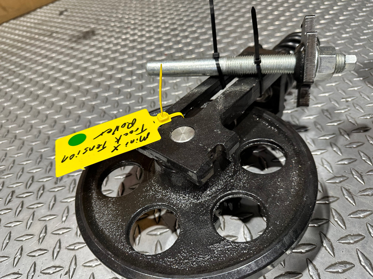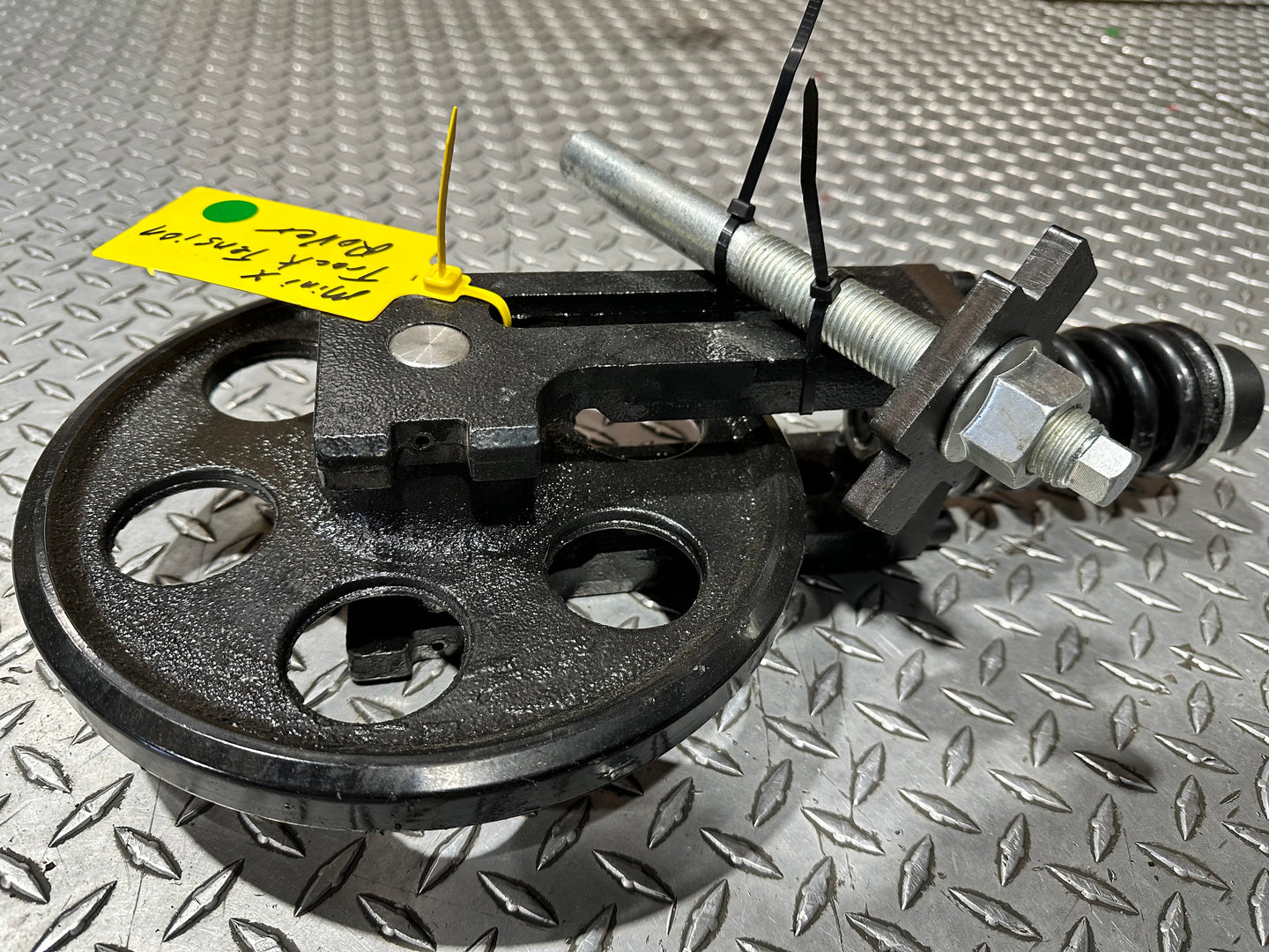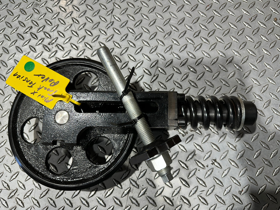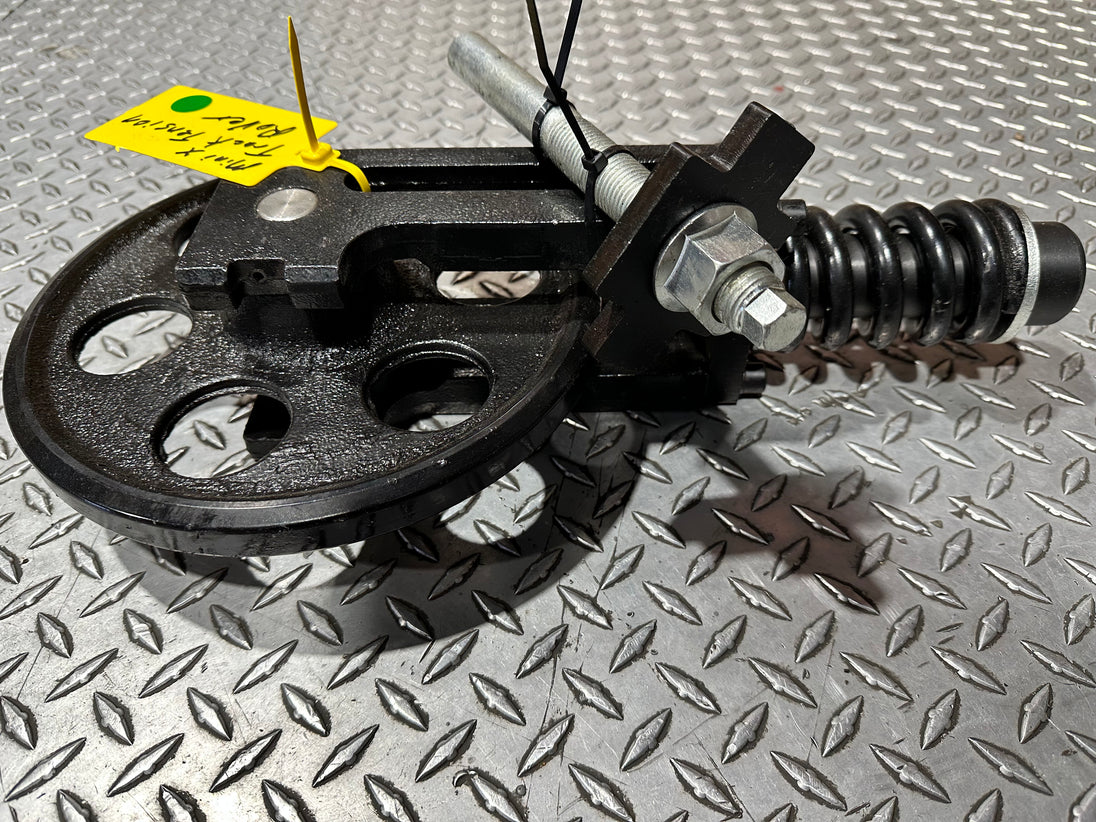 The Mini Excavator Track Tensioner Roller assembly maintains proper track tension for smooth, reliable machine operation. It features a heavy-duty idler wheel, recoil spring, and grease-adjusted cylinder to absorb impacts and ensure precise track alignment. A reinforced steel yoke securely connects the components, delivering long-lasting durability and undercarriage protection.