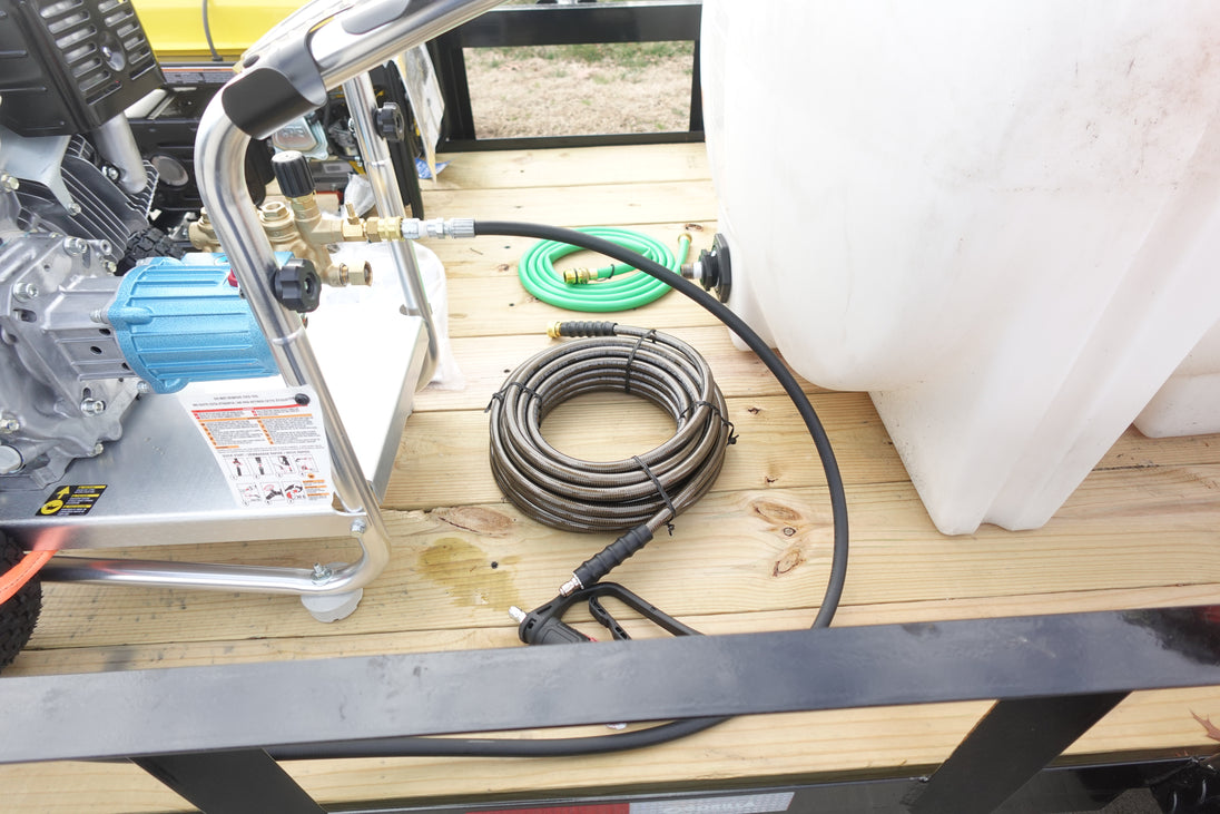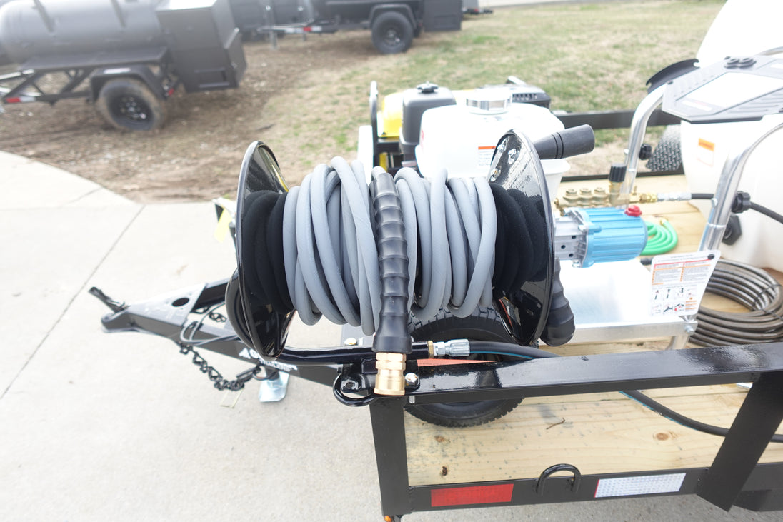 Package includes: Simpson PS4240 4200 PSI pressure washer, 230 gallon water tank, hose reel, 50 feet of hose and a 5'x10' pressure washer.