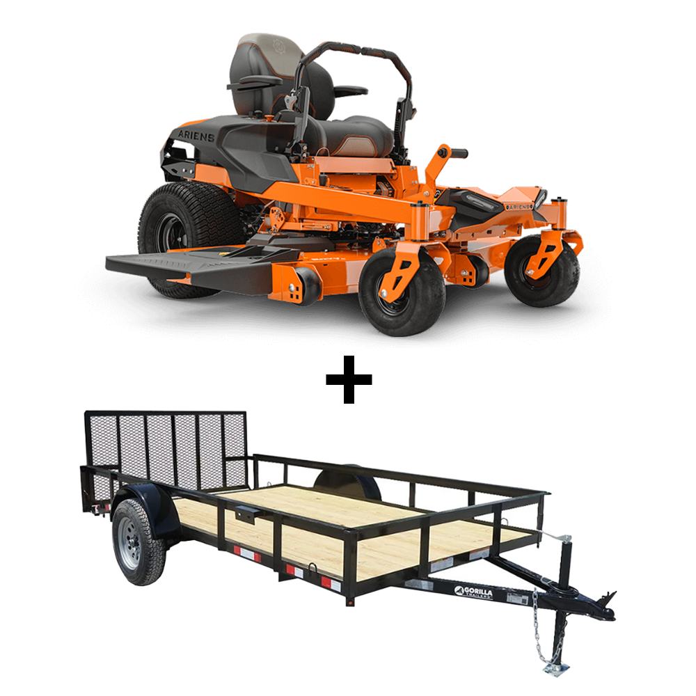 This package includes a 60 -inch Ariens Ikon (918006) zero-turn mower with a 23 horsepower Kawasaki FR691V engine,and one 6.4' x 12' Utility Trailer.