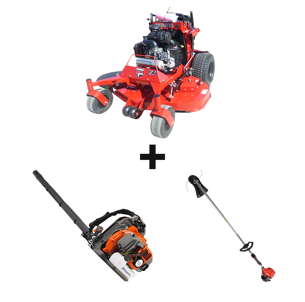 This package deal includes a Ferris 5902164 SRSZ2 52" Stand-On Mower 25.5 HP Kawasaki, a 150BT Backpack Blower and a SRM-225 Straight Shaft String Trimmer.