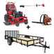 -6%This is a Toro 74534 36-inch GrandStand lawn mower featuring a Kawasaki engine packaged with a 5 x 10 utility dovetail trailer, one Husqvarna 130BT backpack blower, and one Husqvarna 128LD straight-shaft string trimmer.