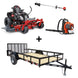 This package includes a 60-inch Toro Titan MyRIDE zero-turn mower with a 26-horsepower Kohler engine, one Husqvarna 130BT backpack blower, one 128LD straight-shaft string trimmer, and a 6.4-foot by 12-foot utility trailer.