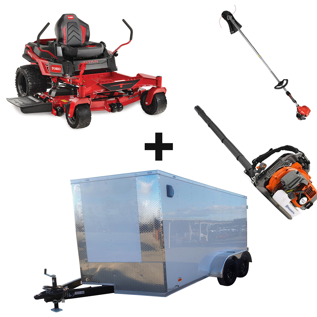 This package deal includes a Toro 76501 54" Titan Zero Turn Mower 26HP Kohler engine, one 6x12 enclosed trailer, one Husqvarna 130BT backpack blower, and one 128LD straight-shaft string trimmer.