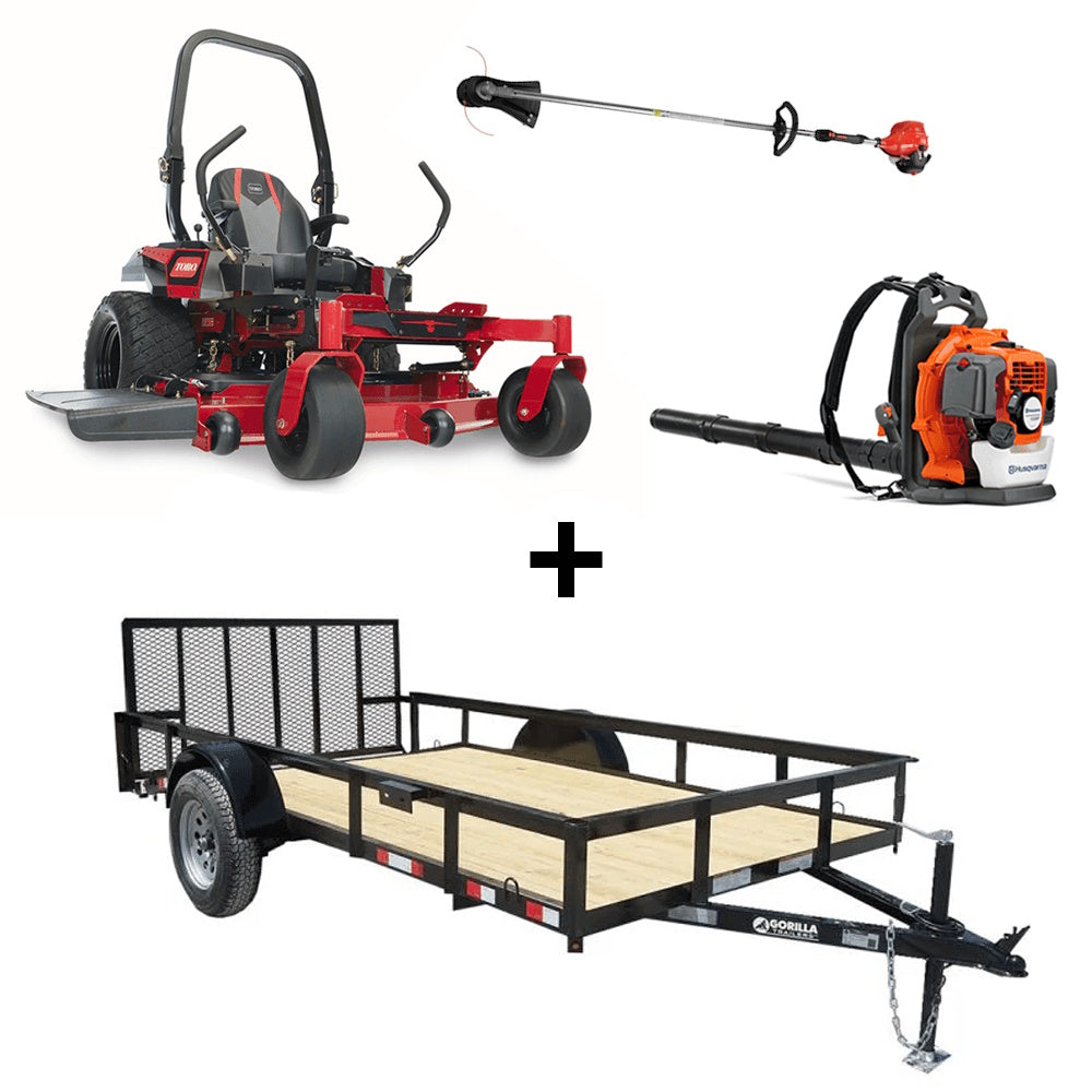 This package deal includes a Toro 76601 60-inch Titan MAX zero-turn mower with a 26HP Kohler engine, one Husqvarna 130BT backpack blower, one 128LD straight-shaft string trimmer, and a 6.4-foot by 12-foot utility trailer.
