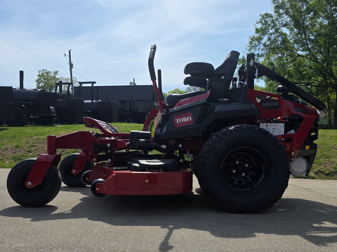 The Toro Z-Master 4000 HDX with MyRIDE® Suspension is a commercial zero-turn mower powered by a 31 HP Kawasaki FX921V engine and built for high productivity and durability. It features a 60" 7-gauge TURBO FORCE® cutting deck, heavy-duty commercial hydros, and 26" Voodoo Trac™ drive tires for superior traction and professional cut quality. The MyRIDE® suspension platform, deluxe suspension seat, LED lights, USB ports, and built-in phone and cup holders provide comfort and convenience for long workdays.