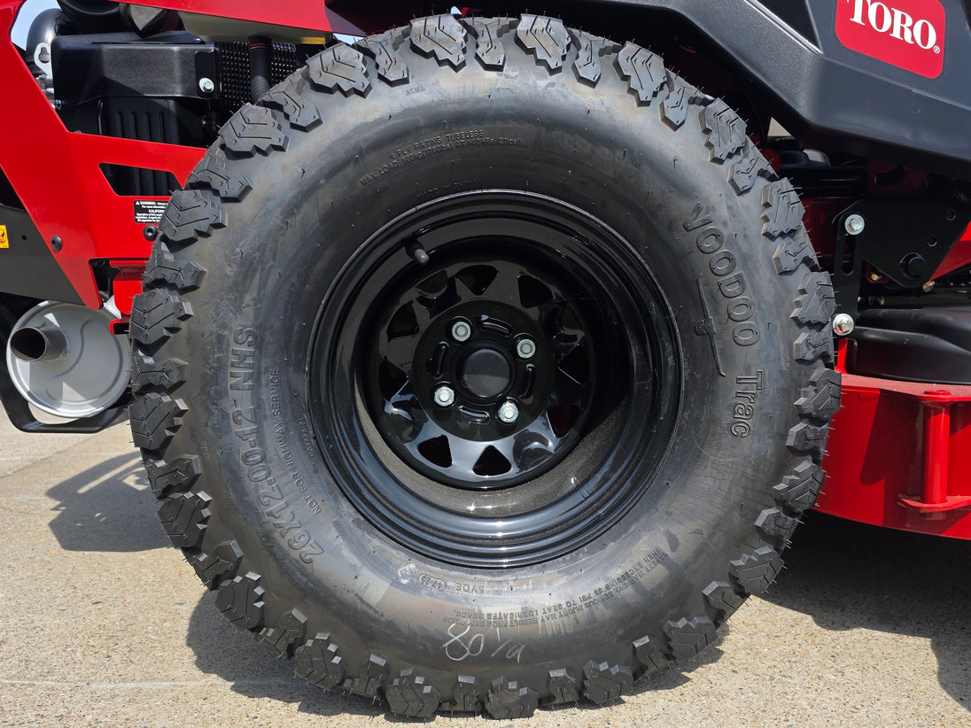 26" Voodoo Trac™ Drive Tires: Large aggressive-tread tires provide excellent traction, improved hillside performance, and a commanding view of the mowing area.