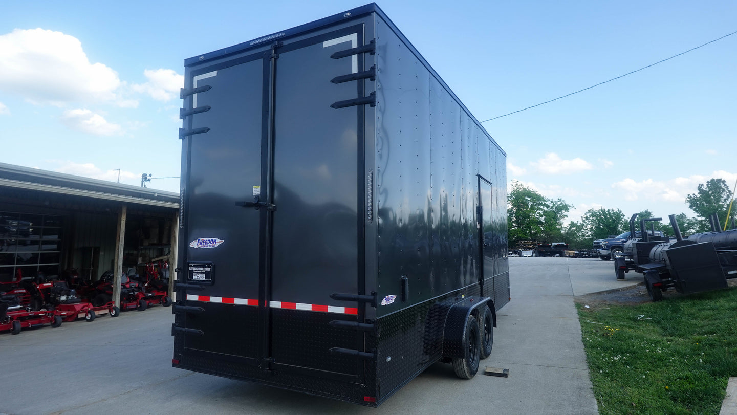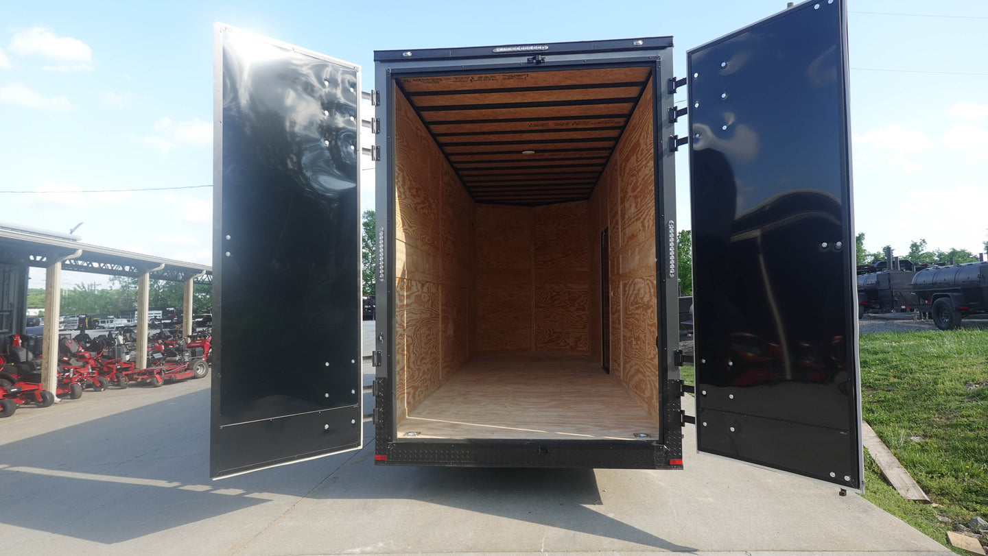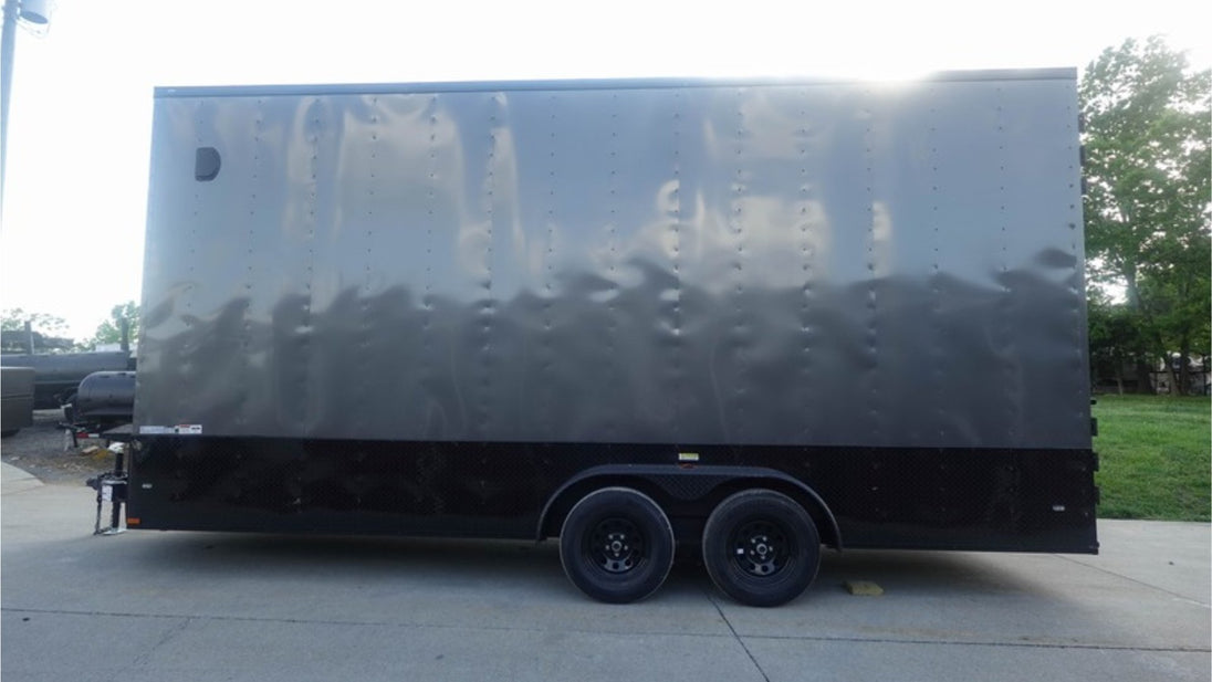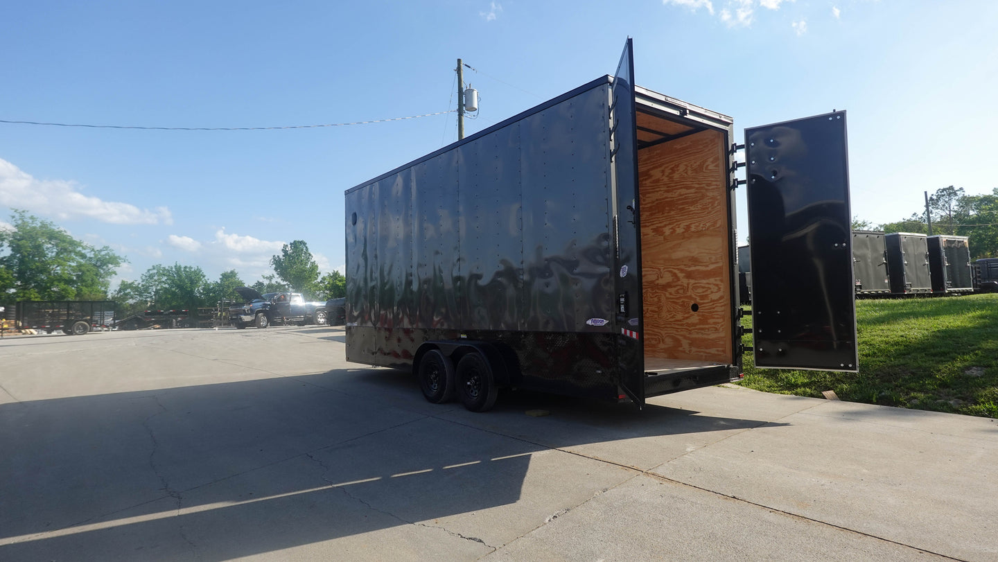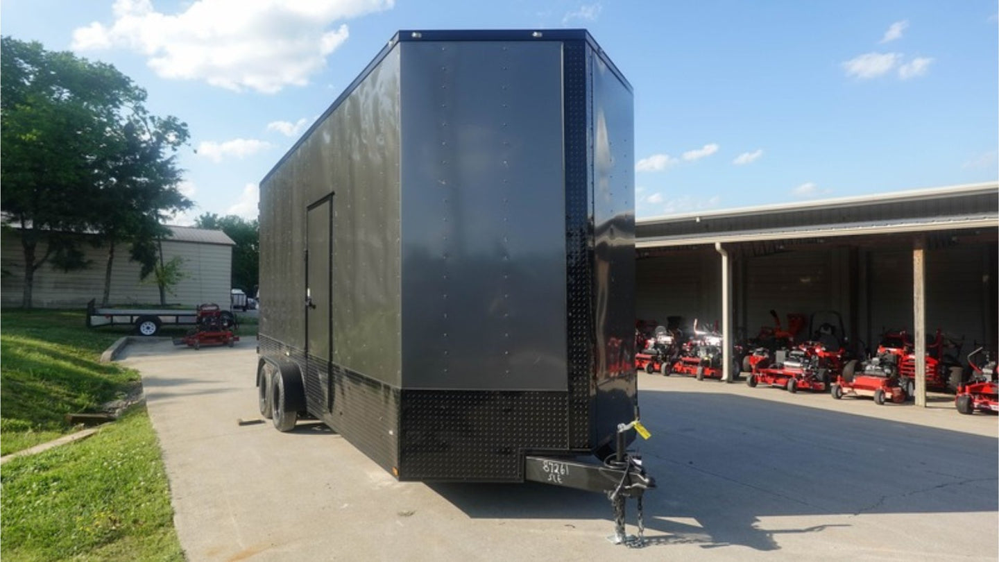 This 7x20 V-nose enclosed trailer delivers the space and strength needed for serious hauling. Featuring a sharp charcoal exterior with blackout accents and reinforced construction, it's ready for both work and weekend missions.