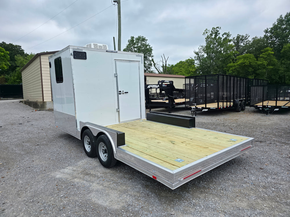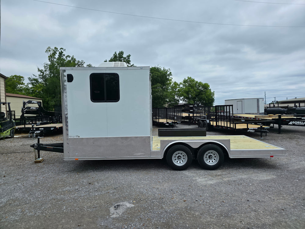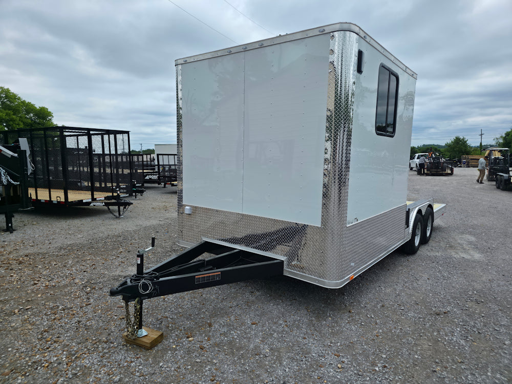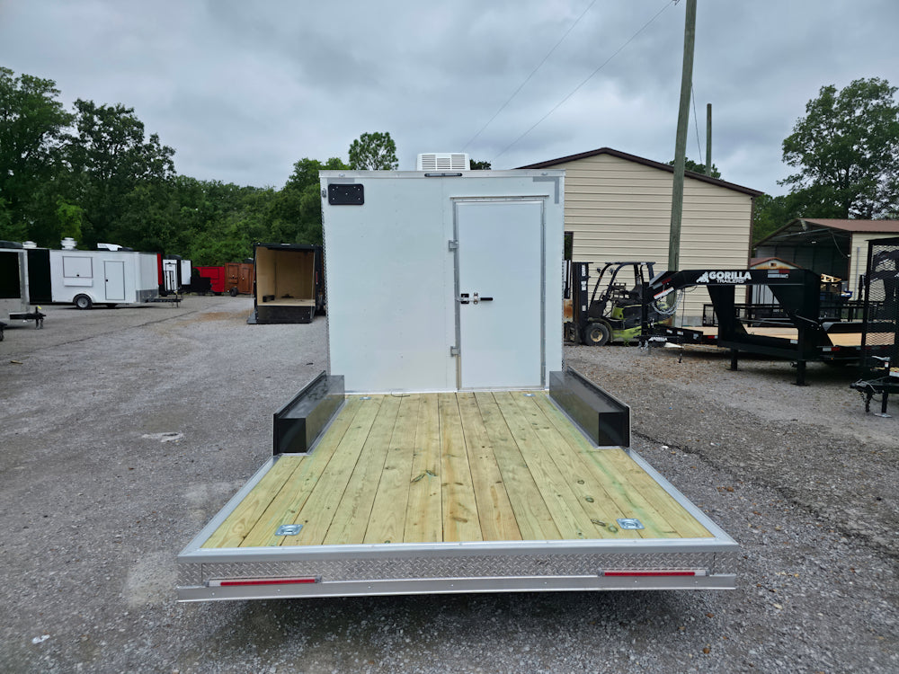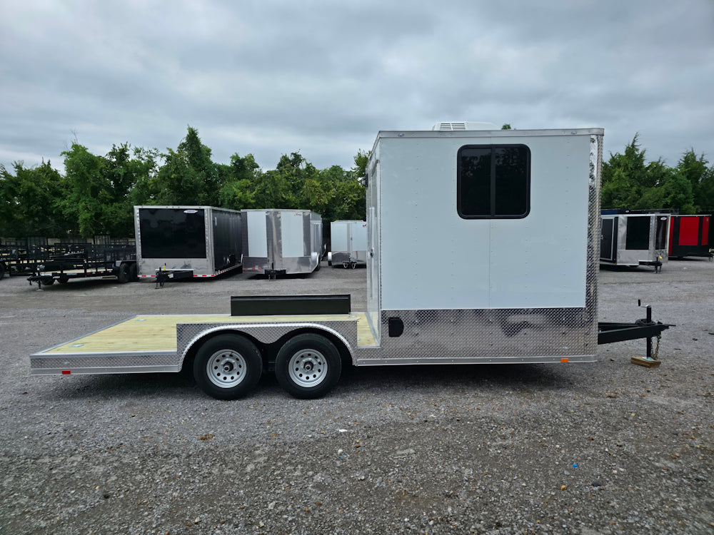 This 8.5' x 20' custom white hybrid trailer blends an 8' enclosed climate-controlled workspace with a 12' open utility deck for versatile use. Outfitted with dual 5,200 lb axles, A/C and heat, pressure-treated flooring, and a 50 AMP electrical system, it’s built for dependable performance and comfort. Features like built-in D-rings, large windows, extended tongue, and LED lighting make it ideal for hauling, mobile workstations, or event displays.