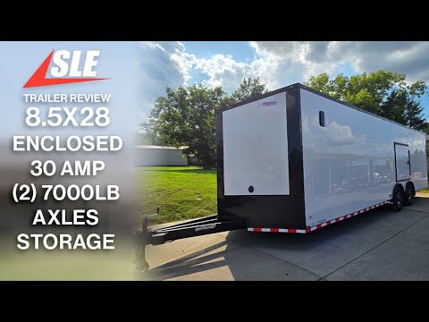 This premium 8.5’ x 28’ enclosed trailer is built for serious hauling, mobile workspace customization, or motorsport and event utility—with a bold White & Blackout exterior, full electrical, and an aerodynamic slanted V-nose for increased space and airflow.