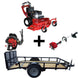 This package includes a 52 inch Bradley (52WT-BS25) walk behind mower with a 25 horsepower Briggs and Stratton V-Twin engine, a Shindaiwa EB600RT backpack blower, a Shindaiwa T235 string trimmer, and a 5x10 utility trailer.
