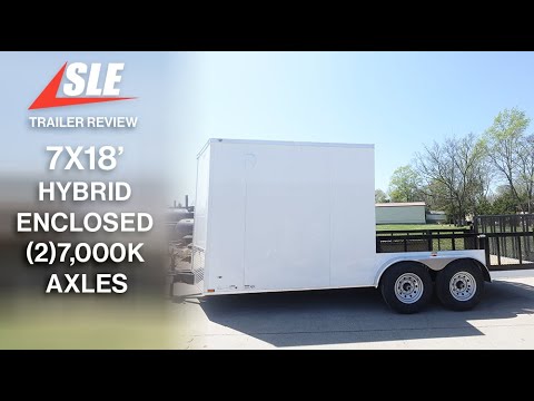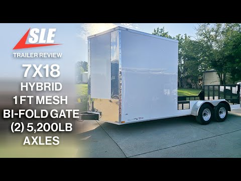 7x18 White Hybrid Enclosed V Nose (2) 7K Axles 2 Ft Fold Down Mesh Sides Pintle Hitch