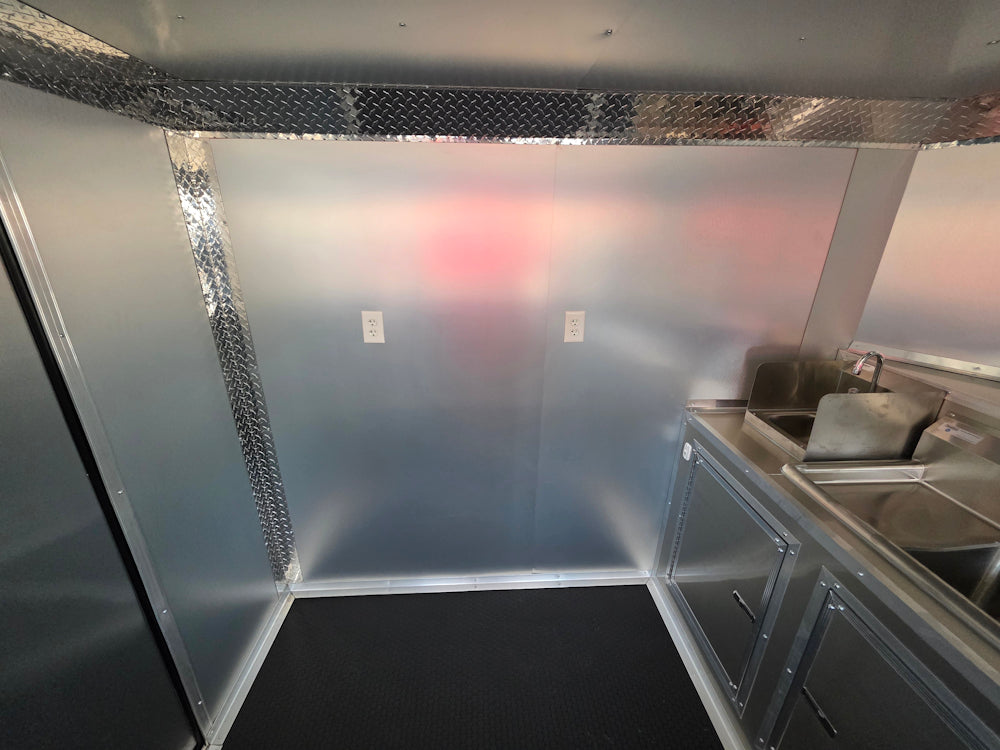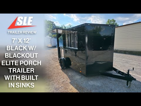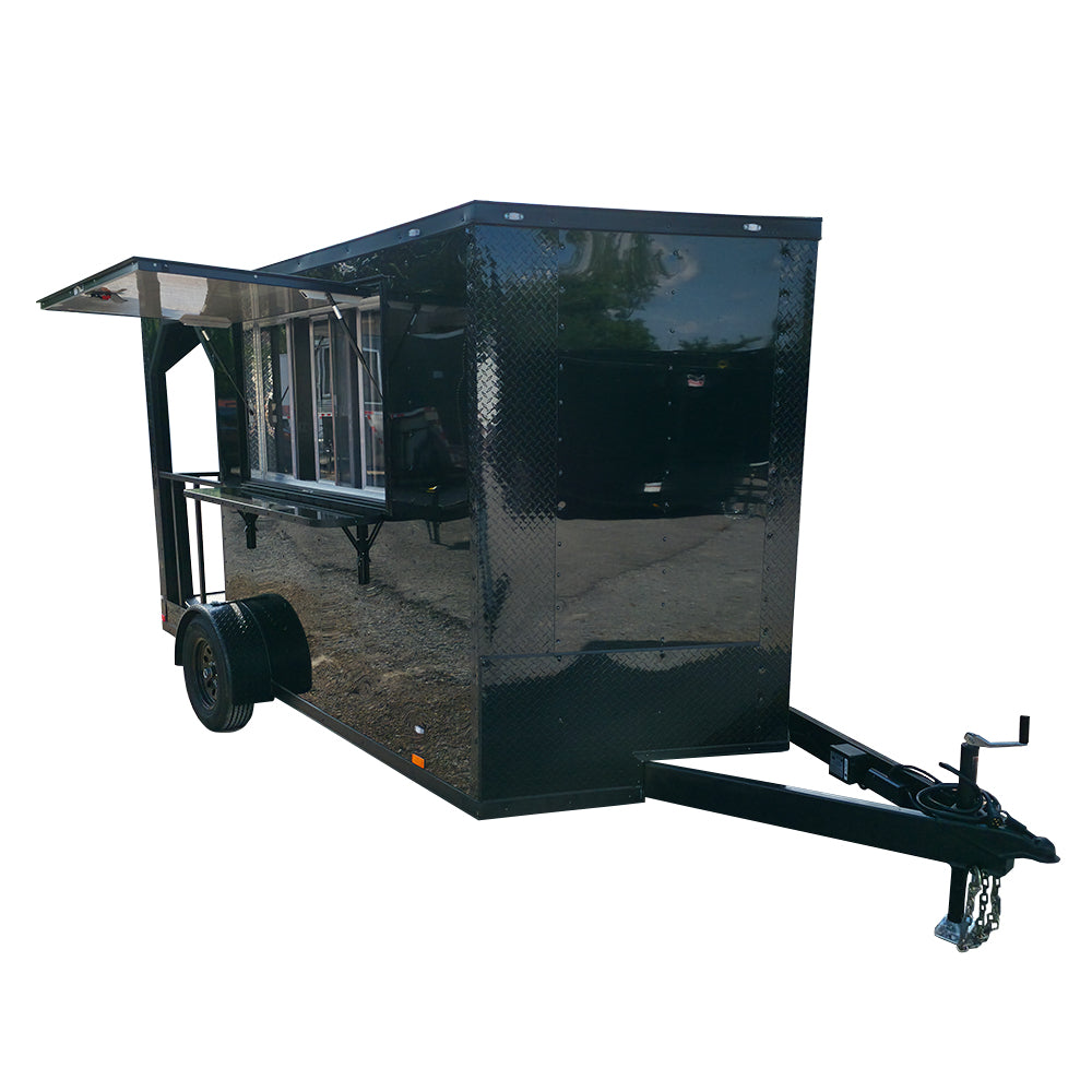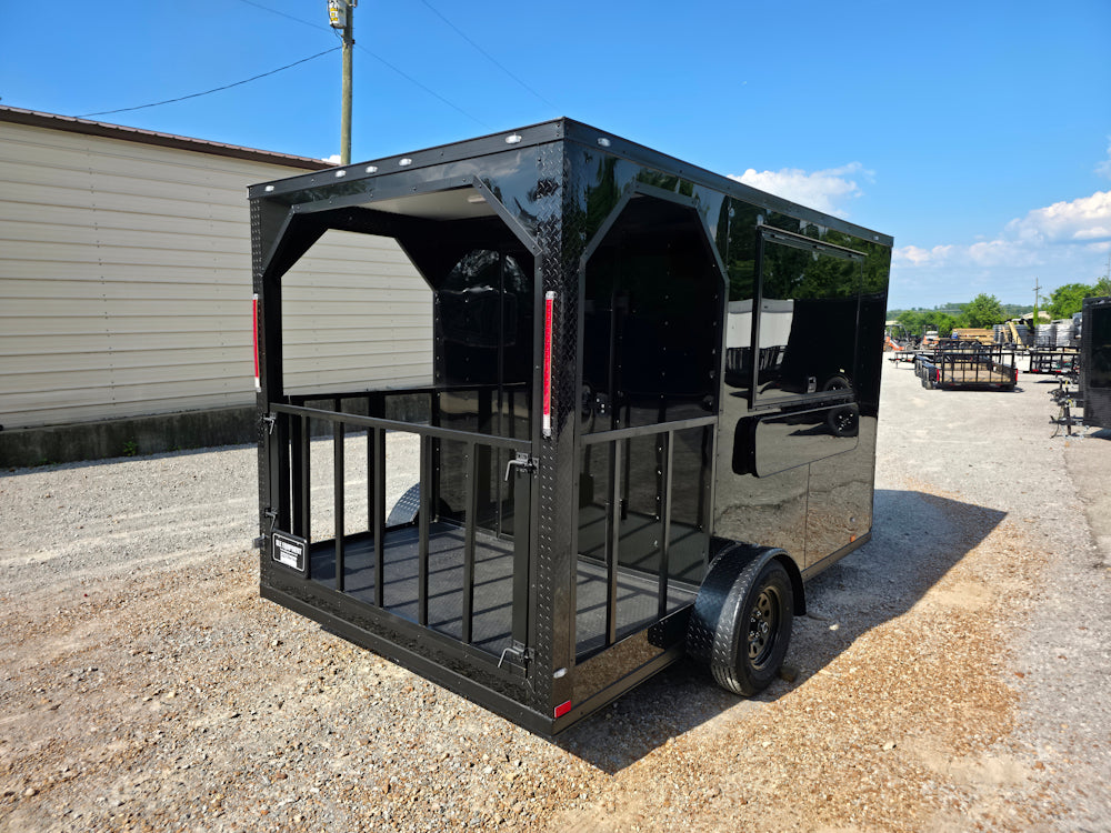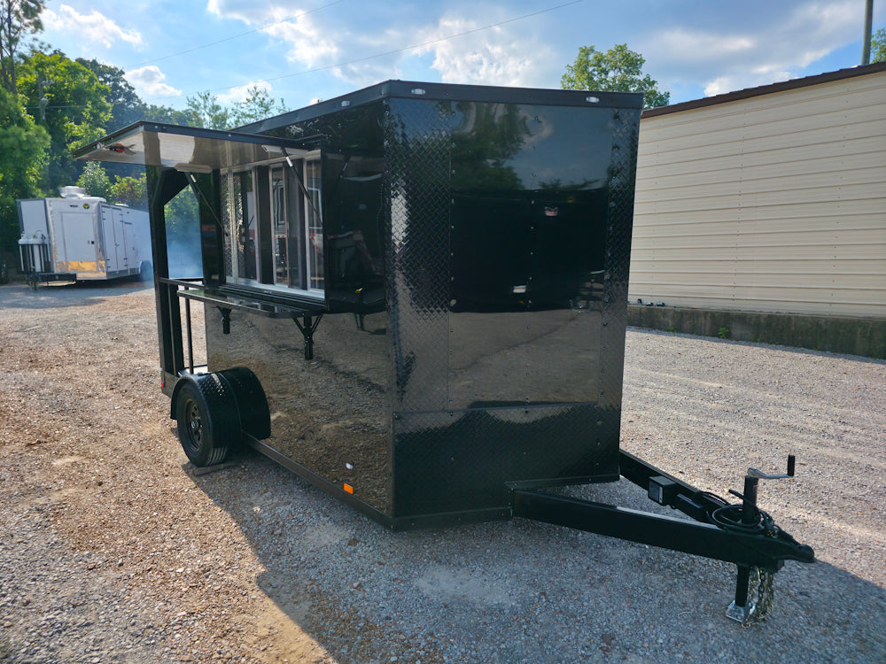 This 7' x 12' custom black concession trailer with a 4' rear porch is built for performance, featuring a removable rear gate, side entry gate, and sleek blackout trim. It includes a 30 Amp electric package, full sink setup with hot water, insulated interior, and a large service window with flip-up counter. With durable rubber coin flooring, LED lighting, it’s ideal for food service, events, and mobile vending operations.