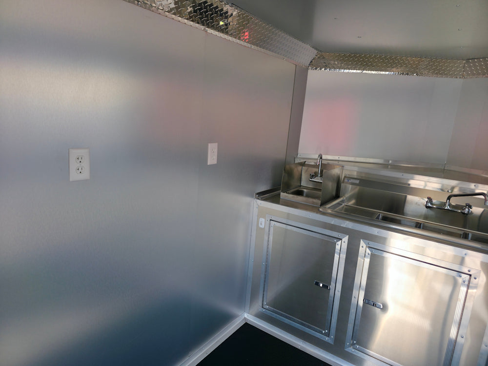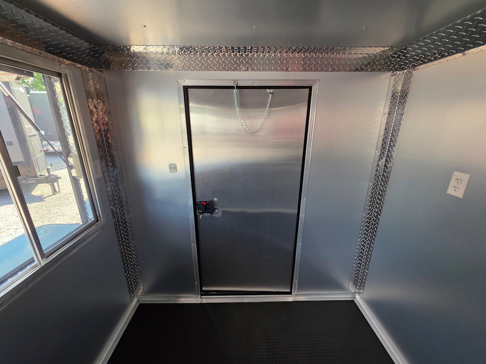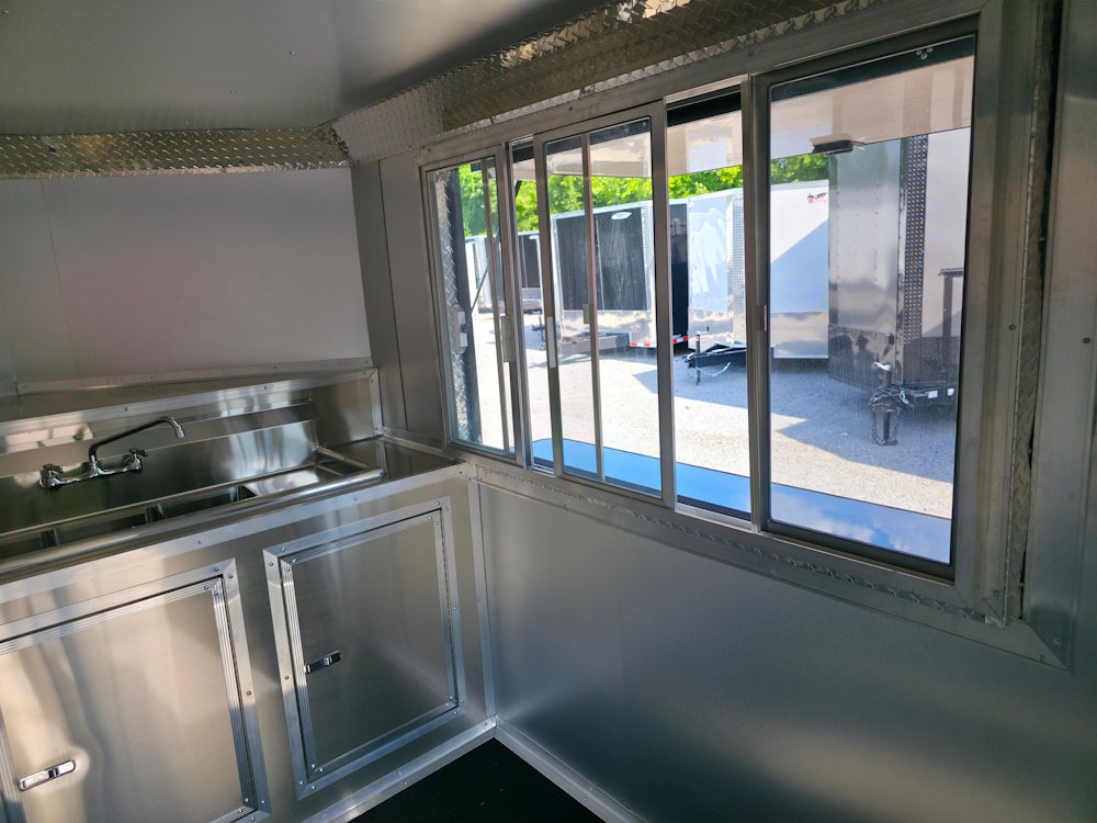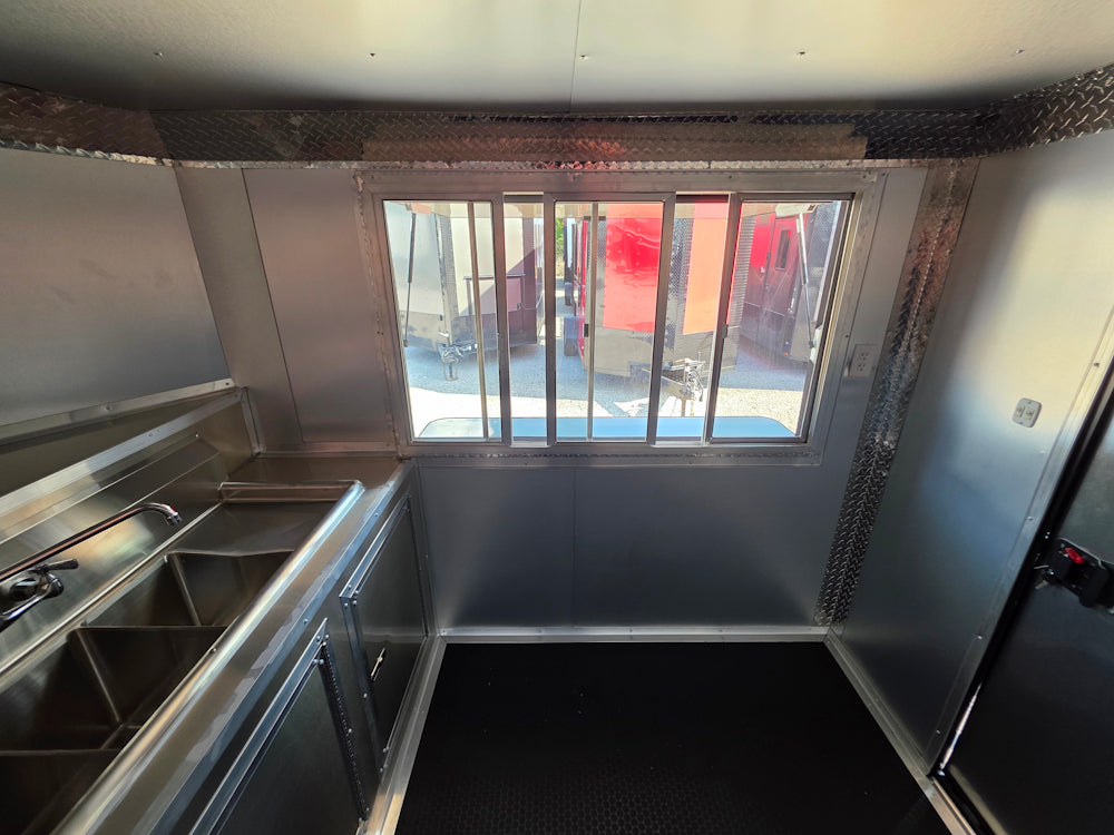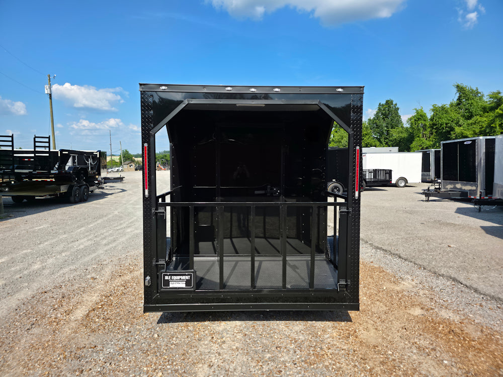 This 7' x 12' custom black concession trailer with a 4' rear porch is built for performance, featuring a removable rear gate, side entry gate, and sleek blackout trim. It includes a 30 Amp electric package, full sink setup with hot water, insulated interior, and a large service window with flip-up counter. With durable rubber coin flooring, LED lighting, it’s ideal for food service, events, and mobile vending operations.