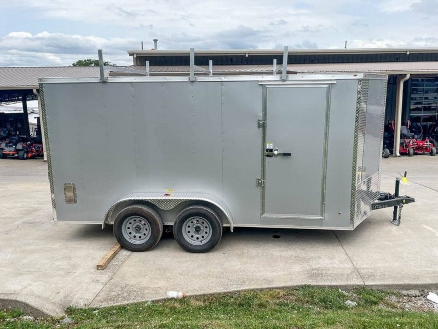 The silver 7-foot by 14-foot v-nose enclosed trailer comes with ladder racks on top for transportation. This trailer features two greaseable 3,500lb axles and a spring-assisted rear loading ramp.